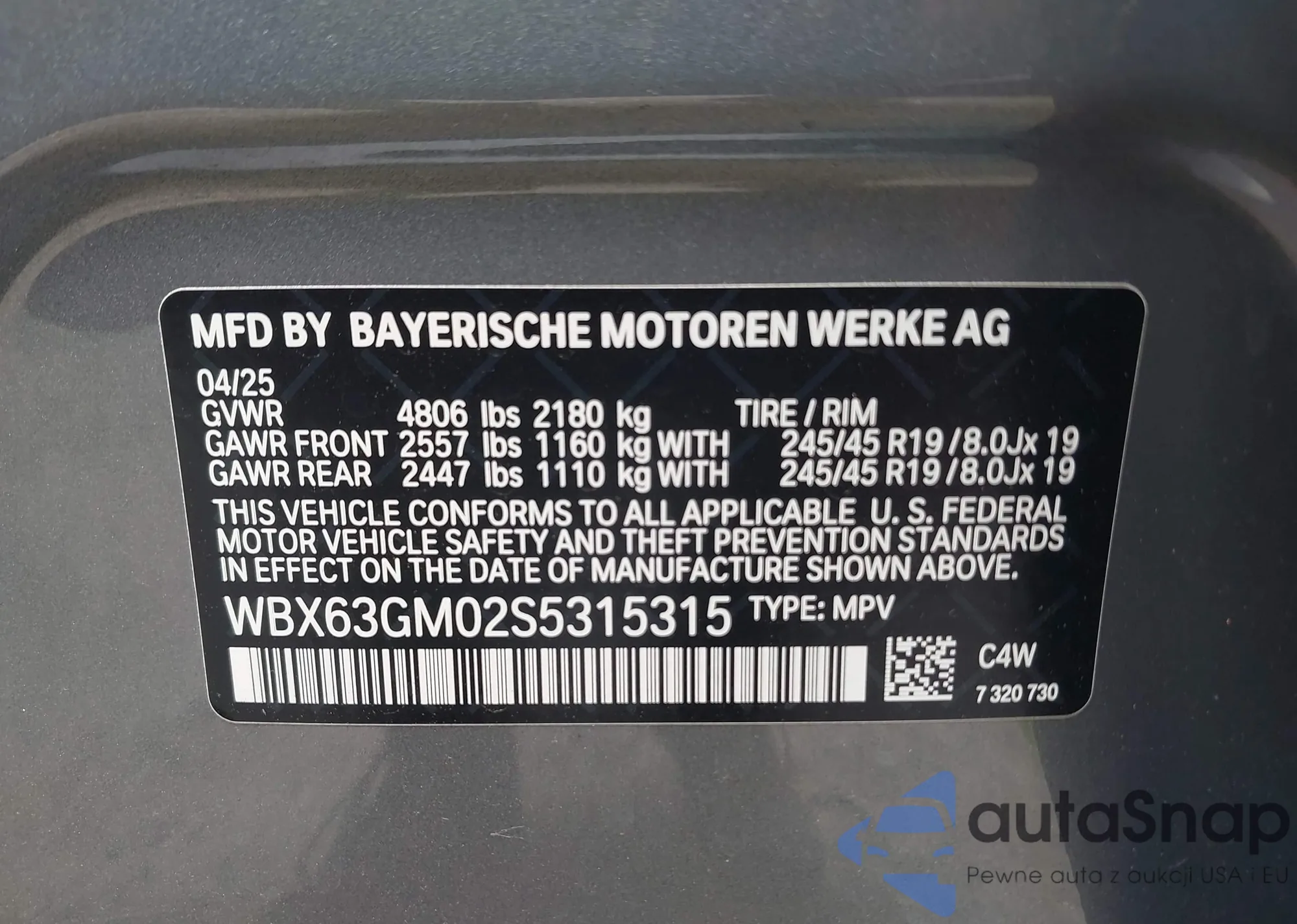 LOT: 42670344 VIN: WBX63GM02S5315315