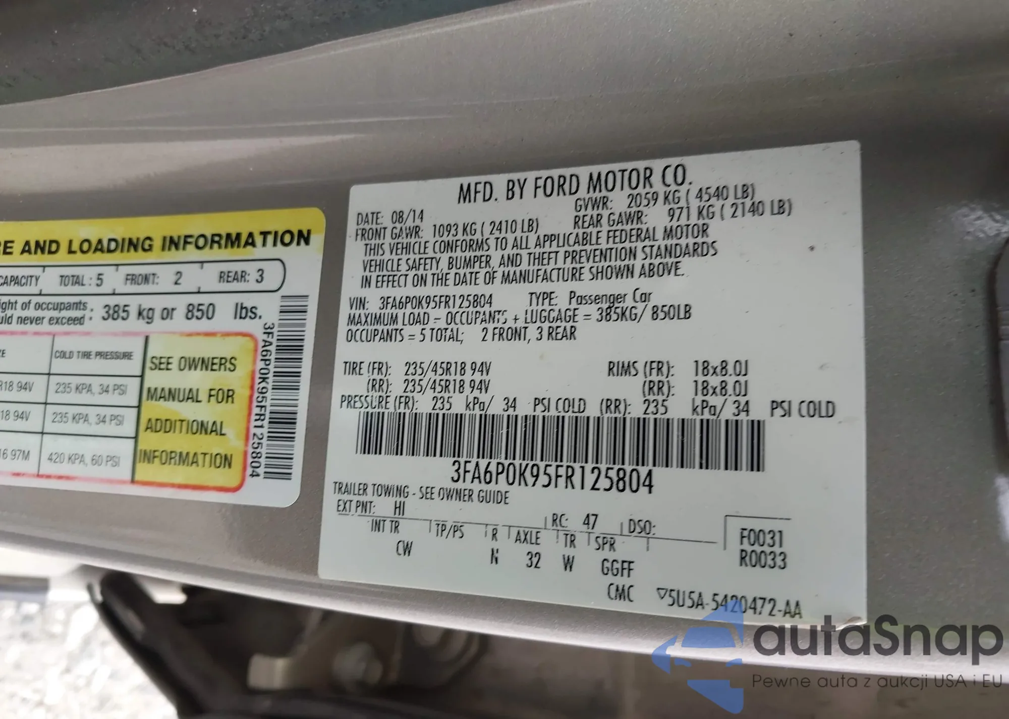 LOT: 42430335 VIN: 3FA6P0K95FR125804