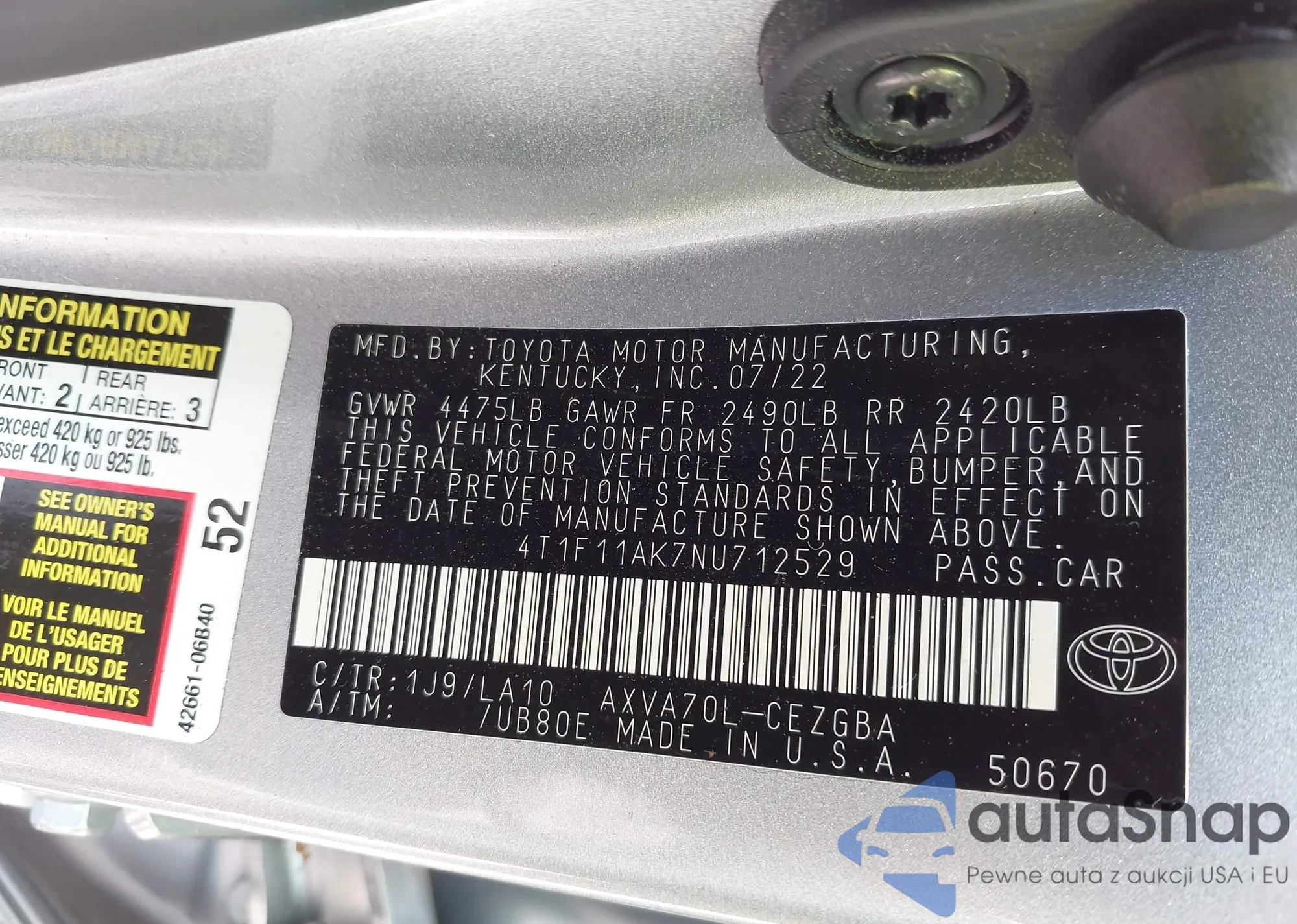 LOT: 42286369 VIN: 4T1F11AK7NU712529