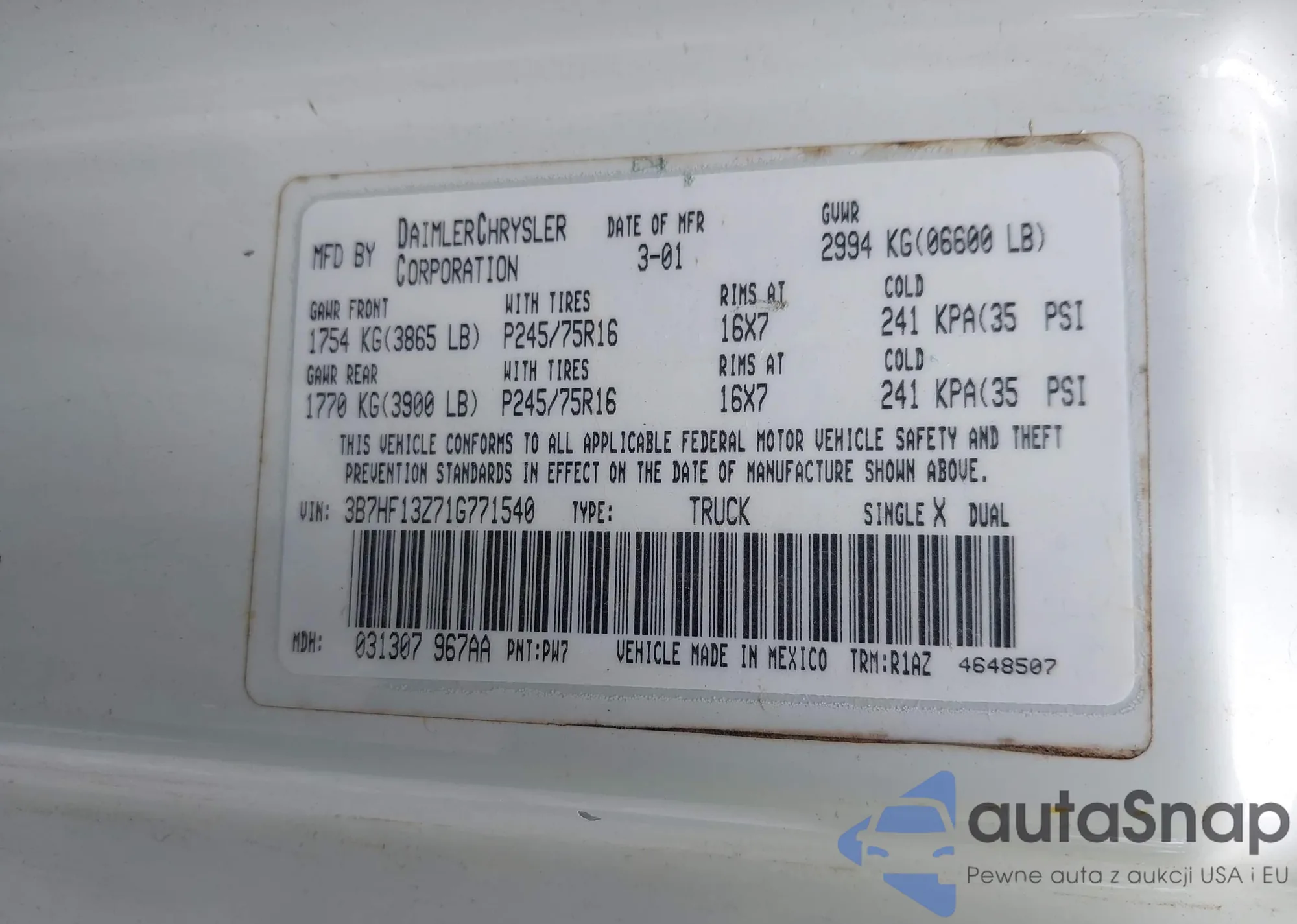 • VIN 3B7HF13Z71G771540