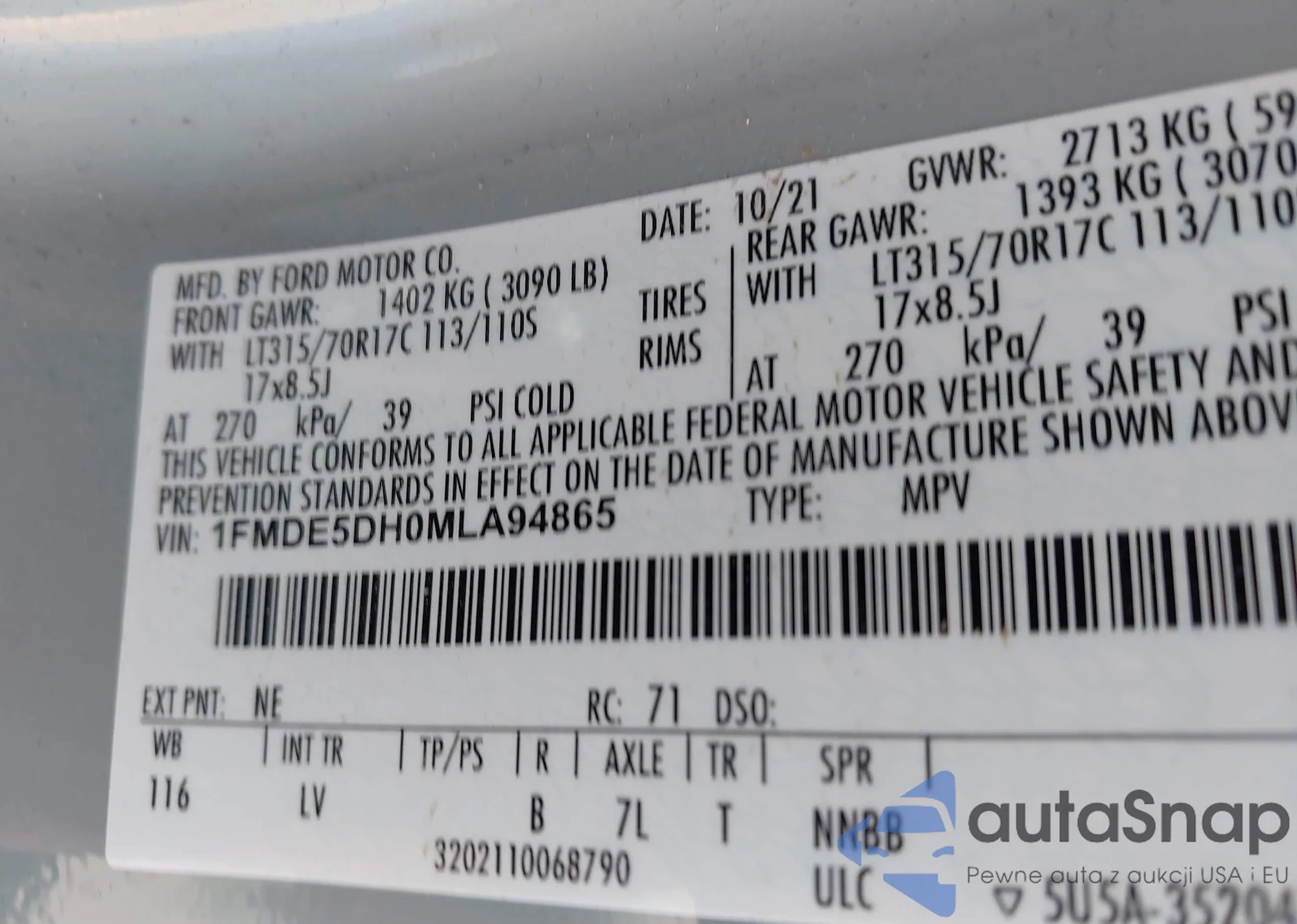 LOT: 42488493 VIN: 1FMDE5DH0MLA94865