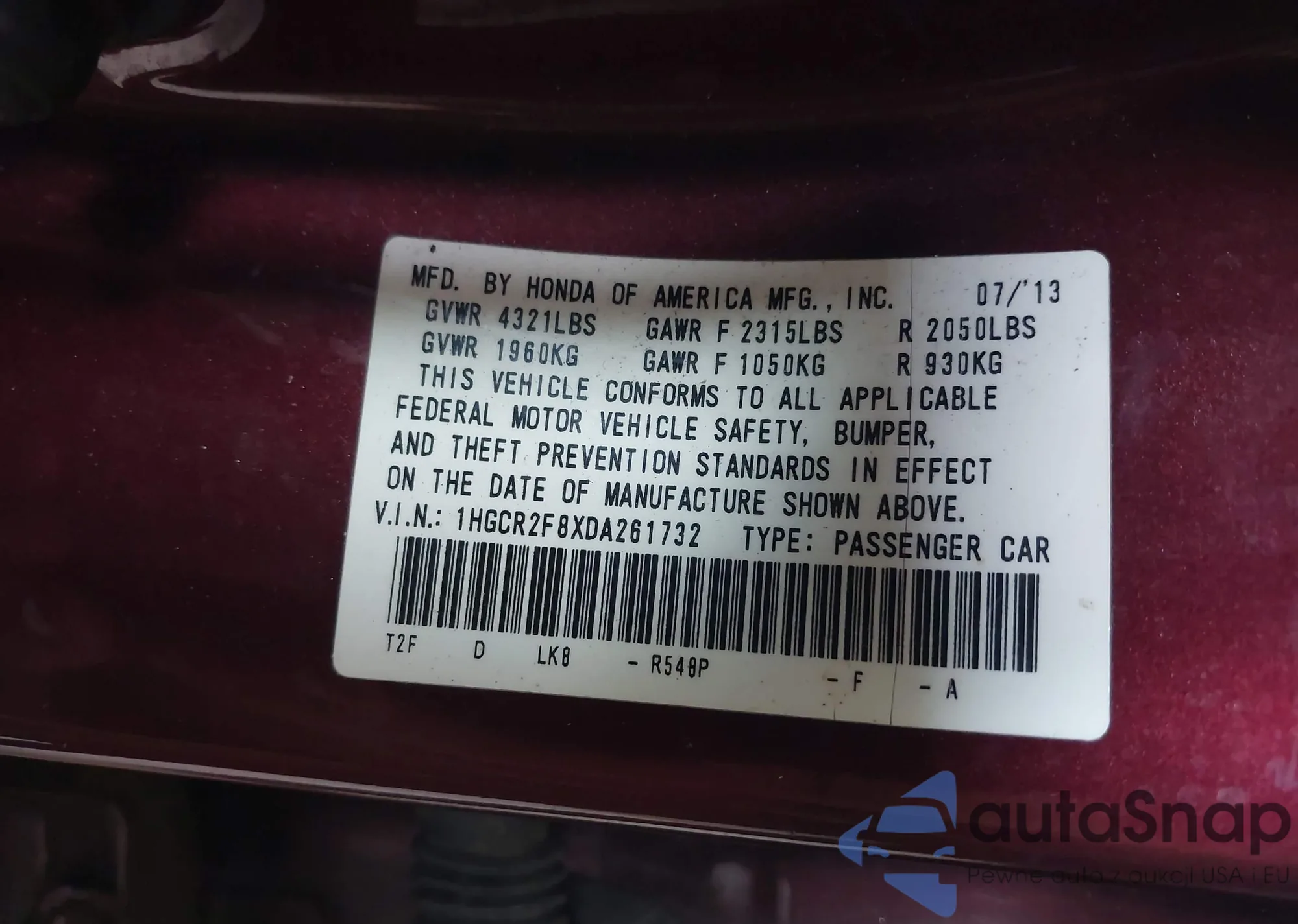 • VIN 1HGCR2F8XDA261732