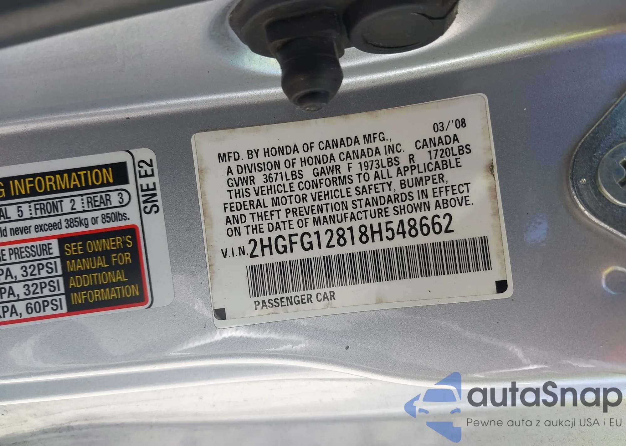 LOT: 42648185 VIN: 2HGFG12818H548662