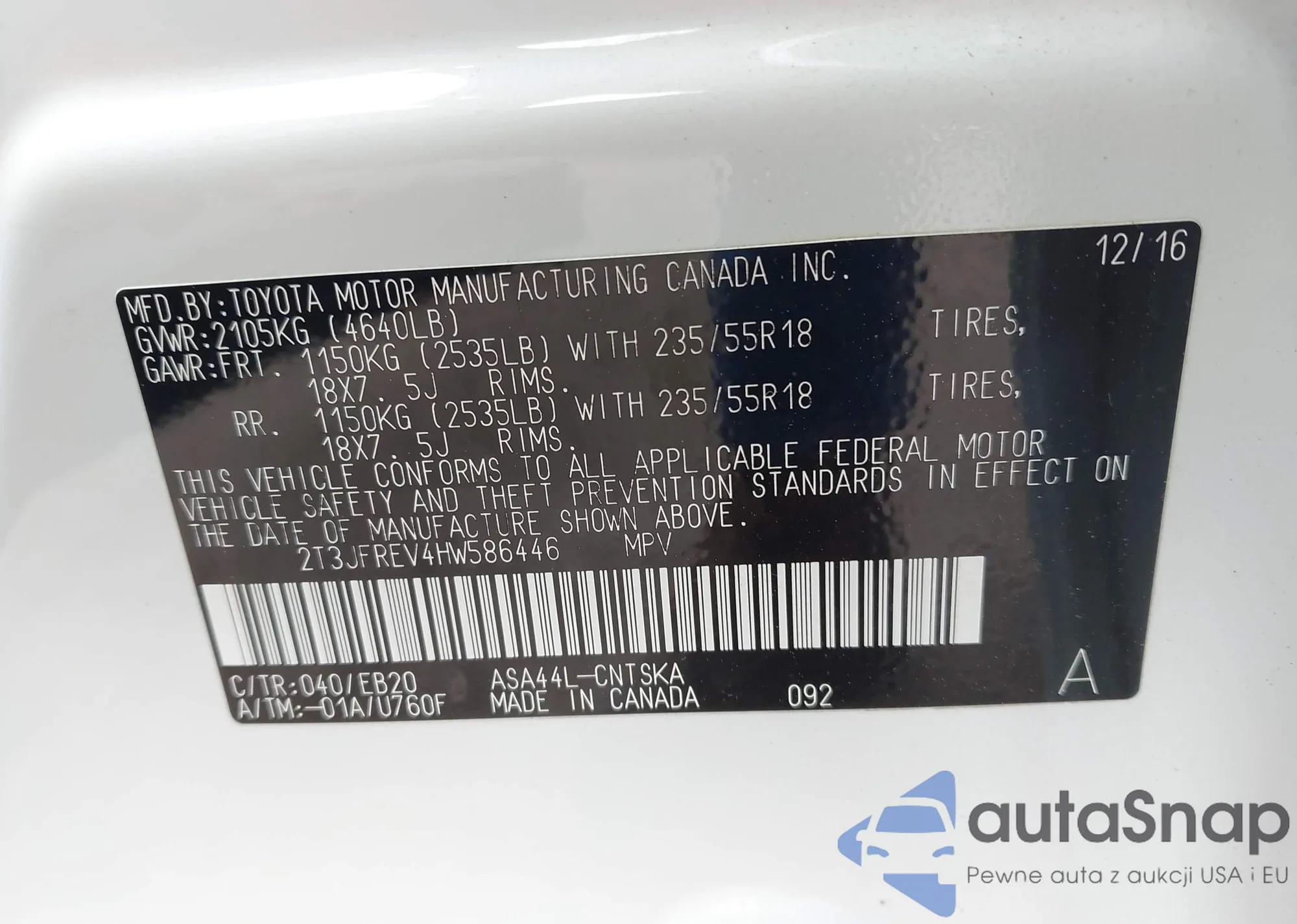 LOT: 42582715 VIN: 2T3JFREV4HW586446