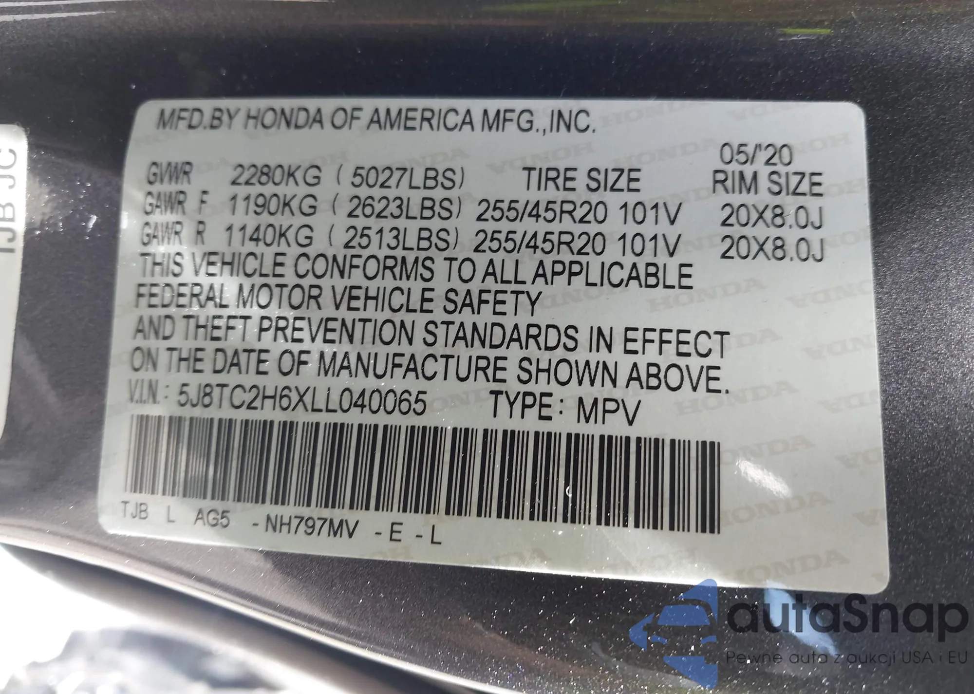 • VIN 5J8TC2H6XLL040065