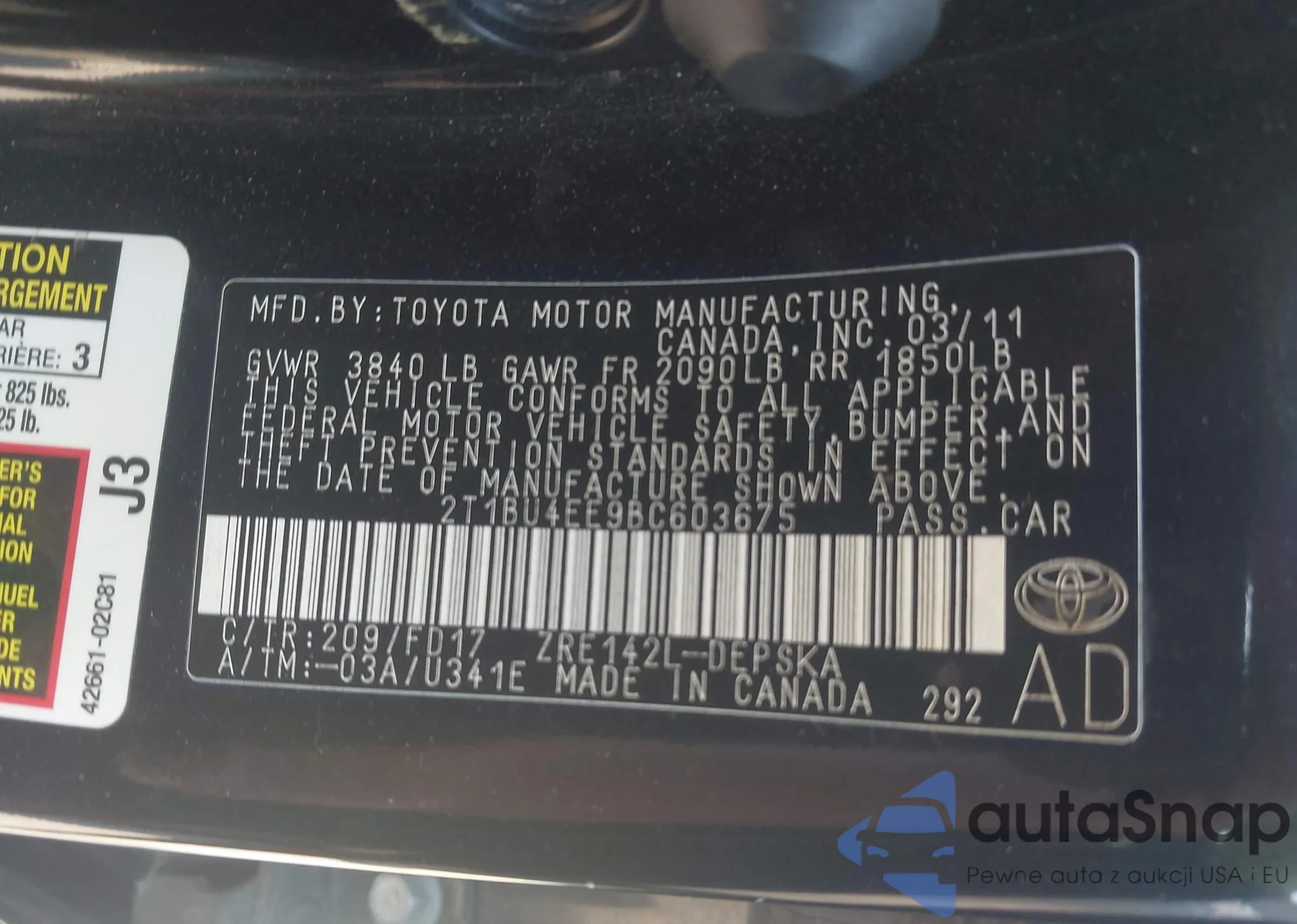 • VIN 2T1BU4EE9BC603675