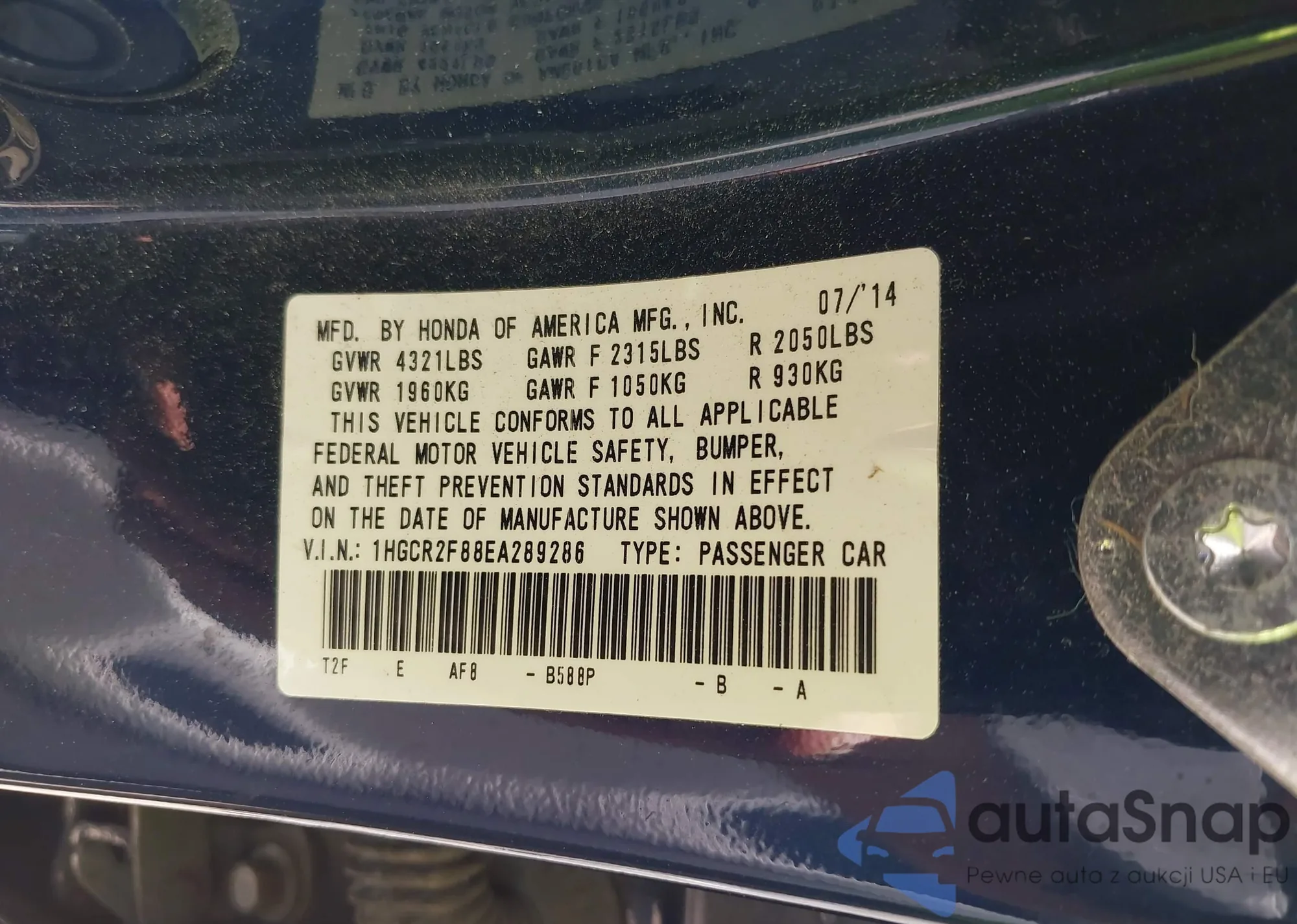 • VIN 1HGCR2F88EA289286