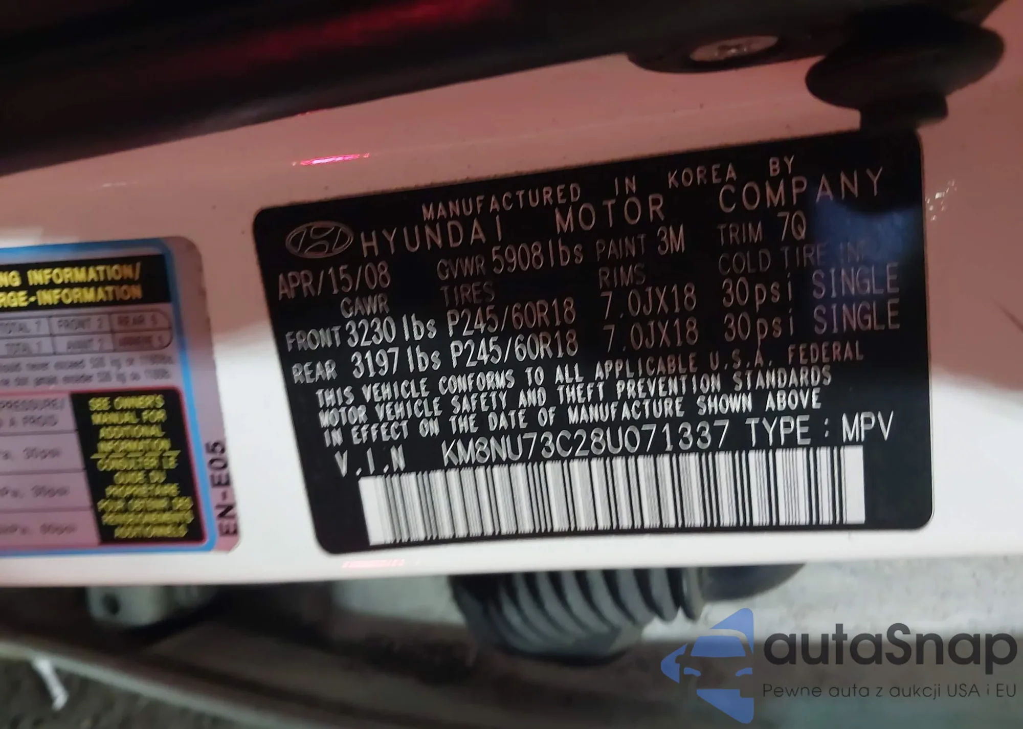 LOT: 42702222 VIN: KM8NU73C28U071337