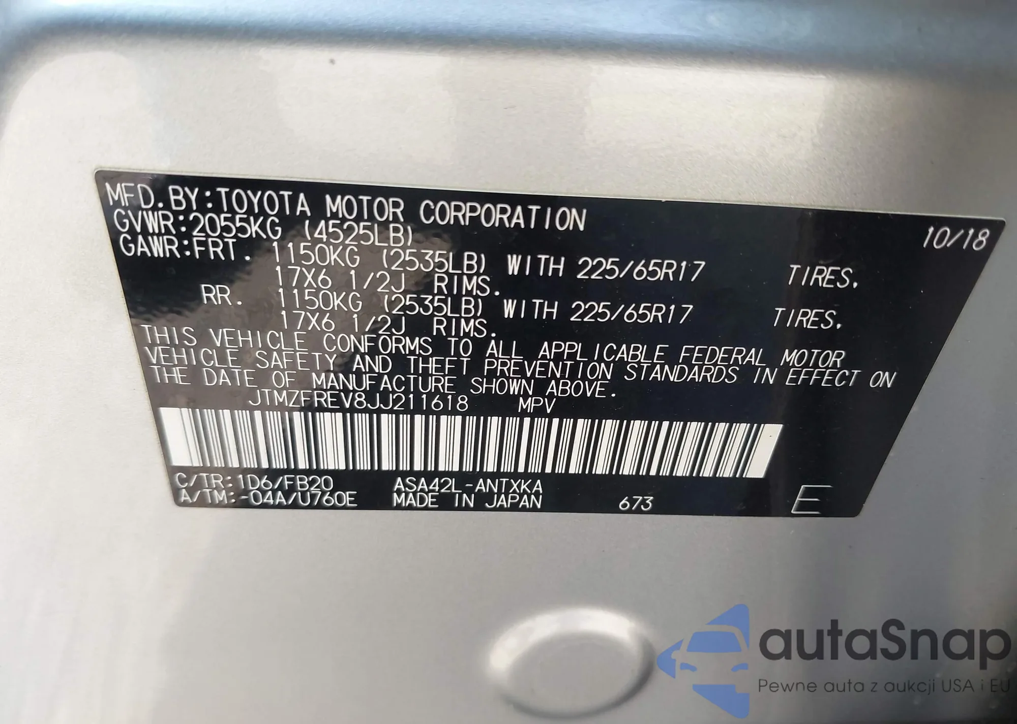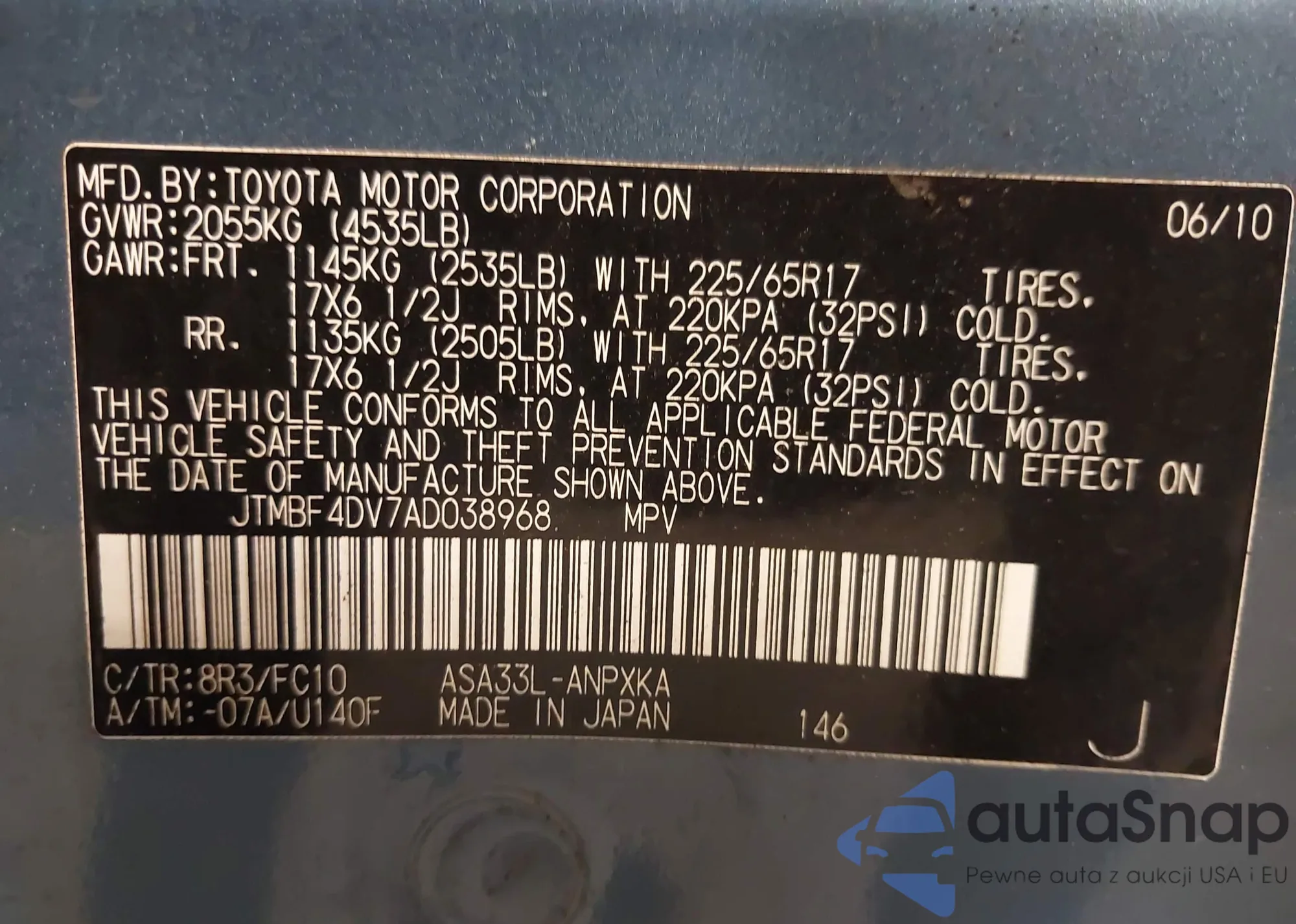 LOT: 42222163 VIN: JTMBF4DV7AD038968