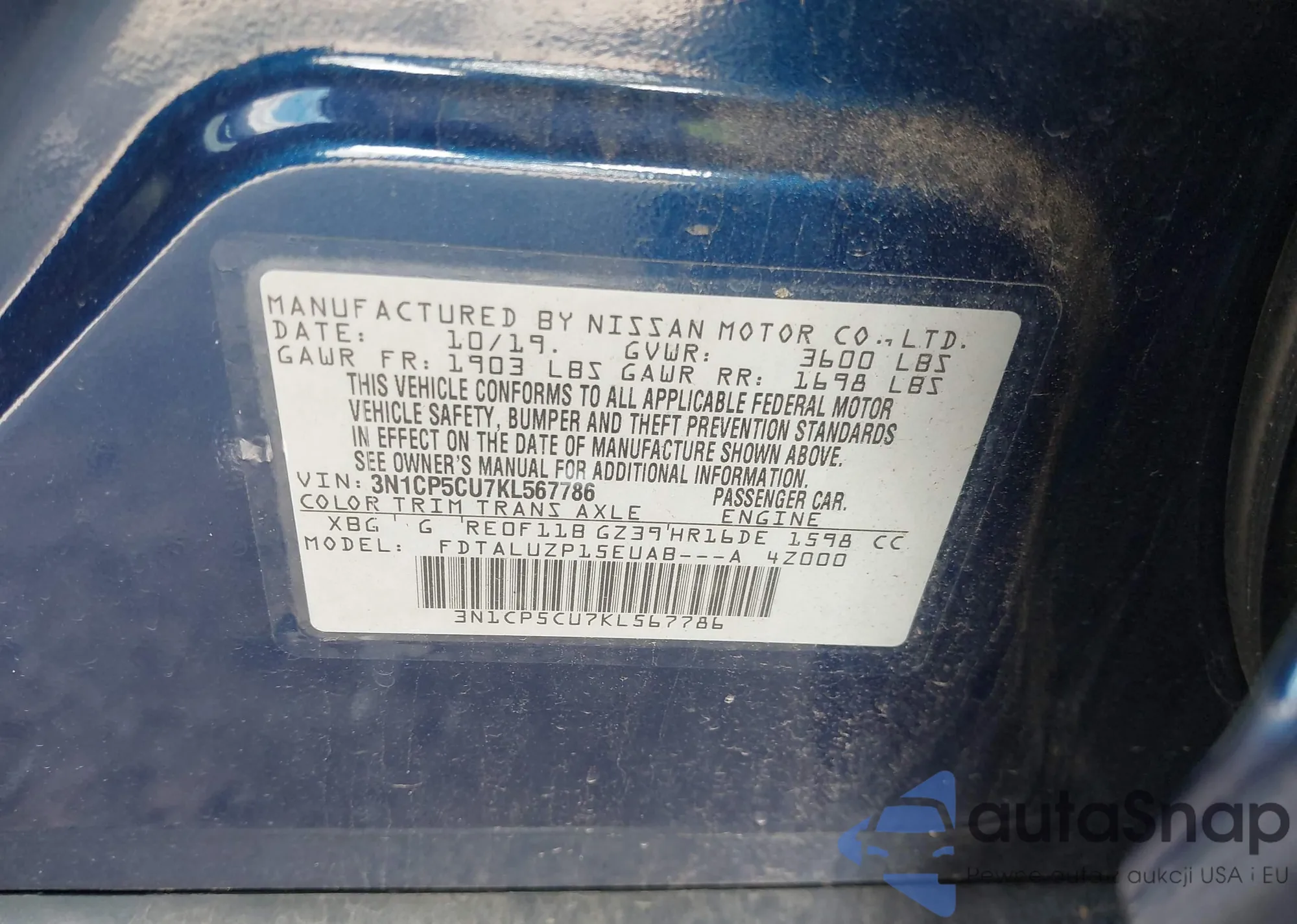 LOT: 42274666 VIN: 3N1CP5CU7KL567786