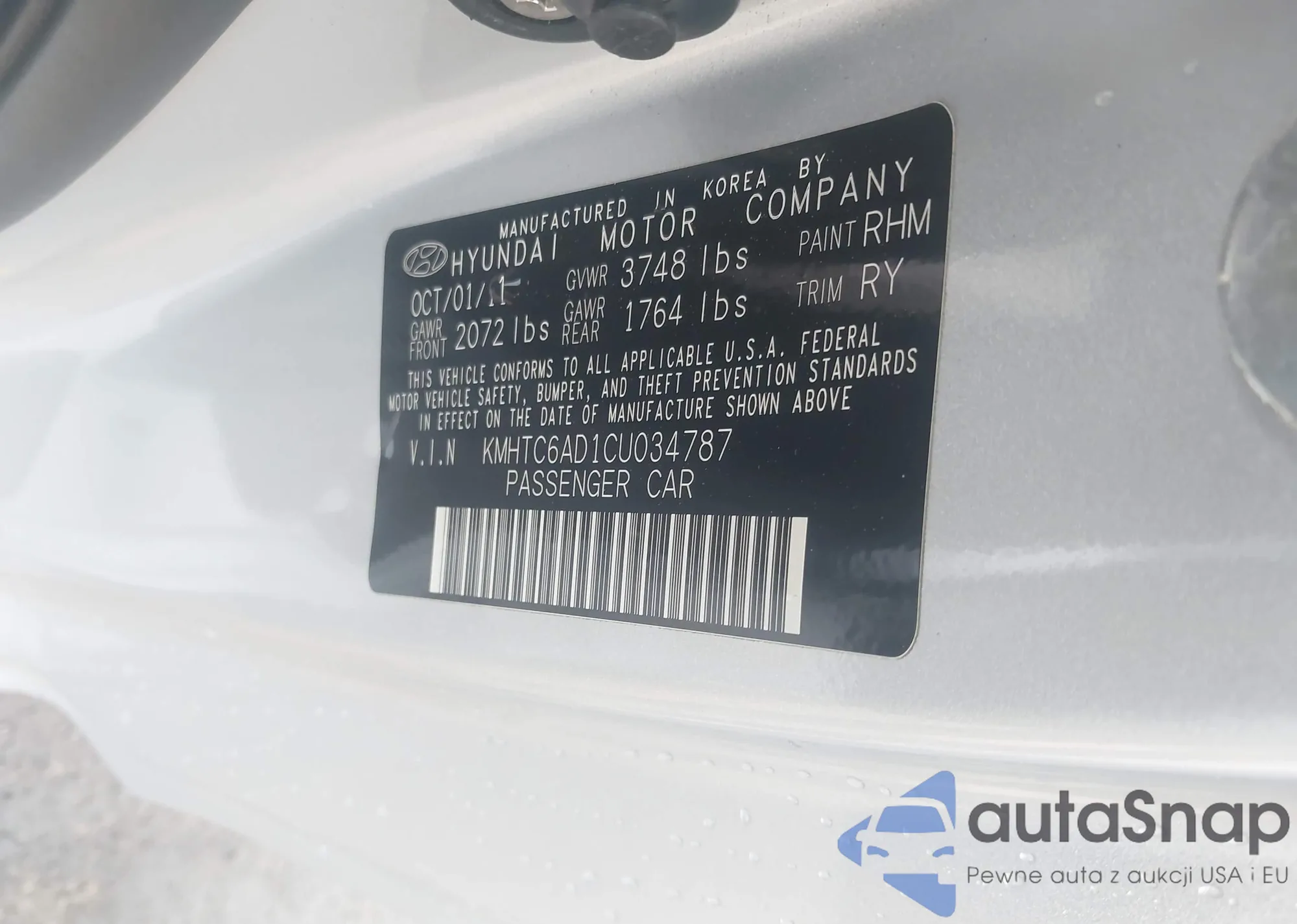 LOT: 42607847 VIN: KMHTC6AD1CU034787