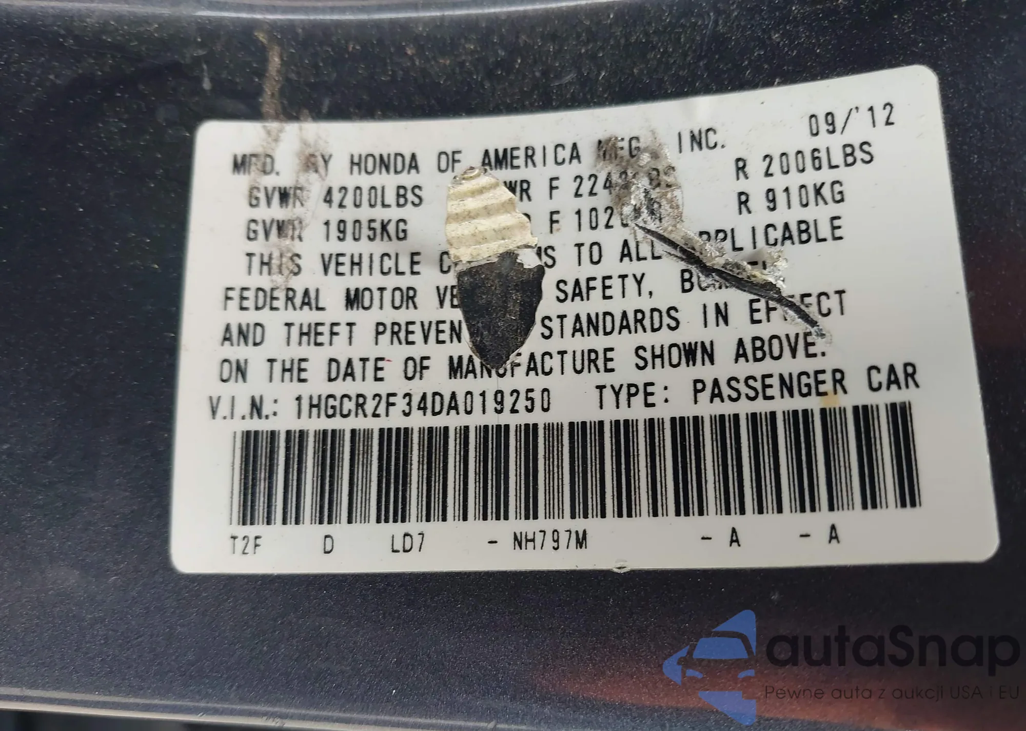 LOT: 42733982 VIN: 1HGCR2F34DA019250