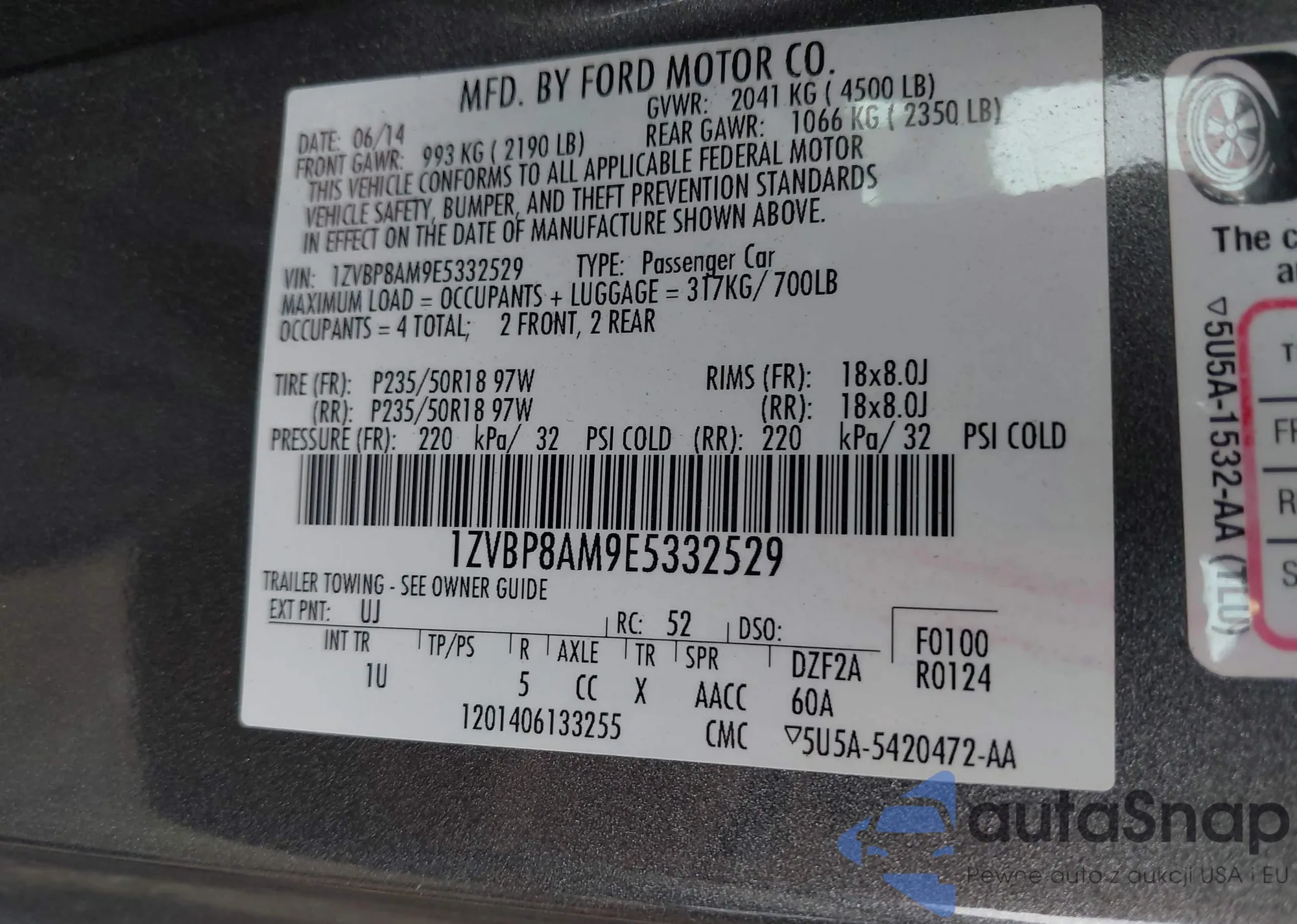 LOT: 42272279 VIN: 1ZVBP8AM9E5332529