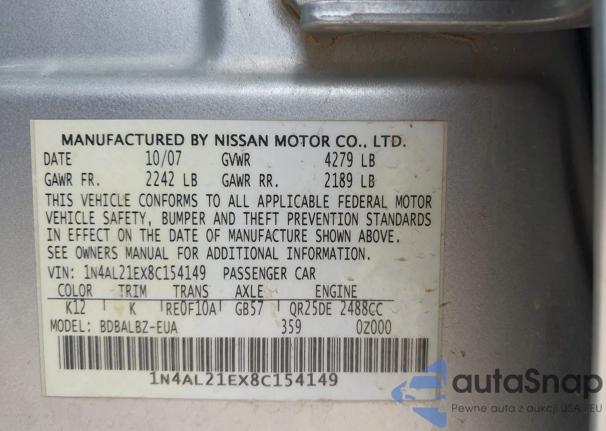 LOT: 42636387 VIN: 1N4AL21EX8C154149