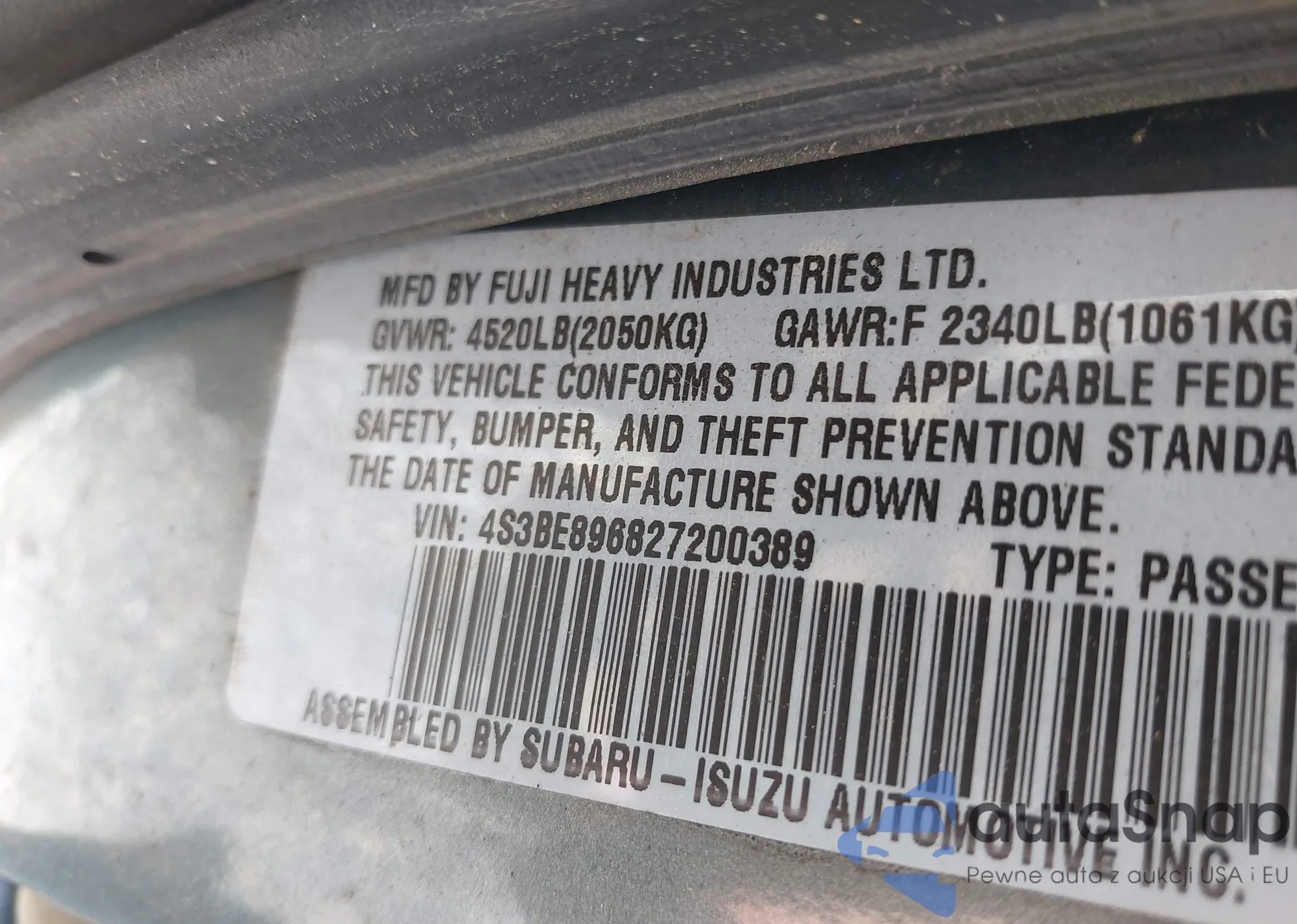 LOT: 41993634 VIN: 4S3BE896827200389
