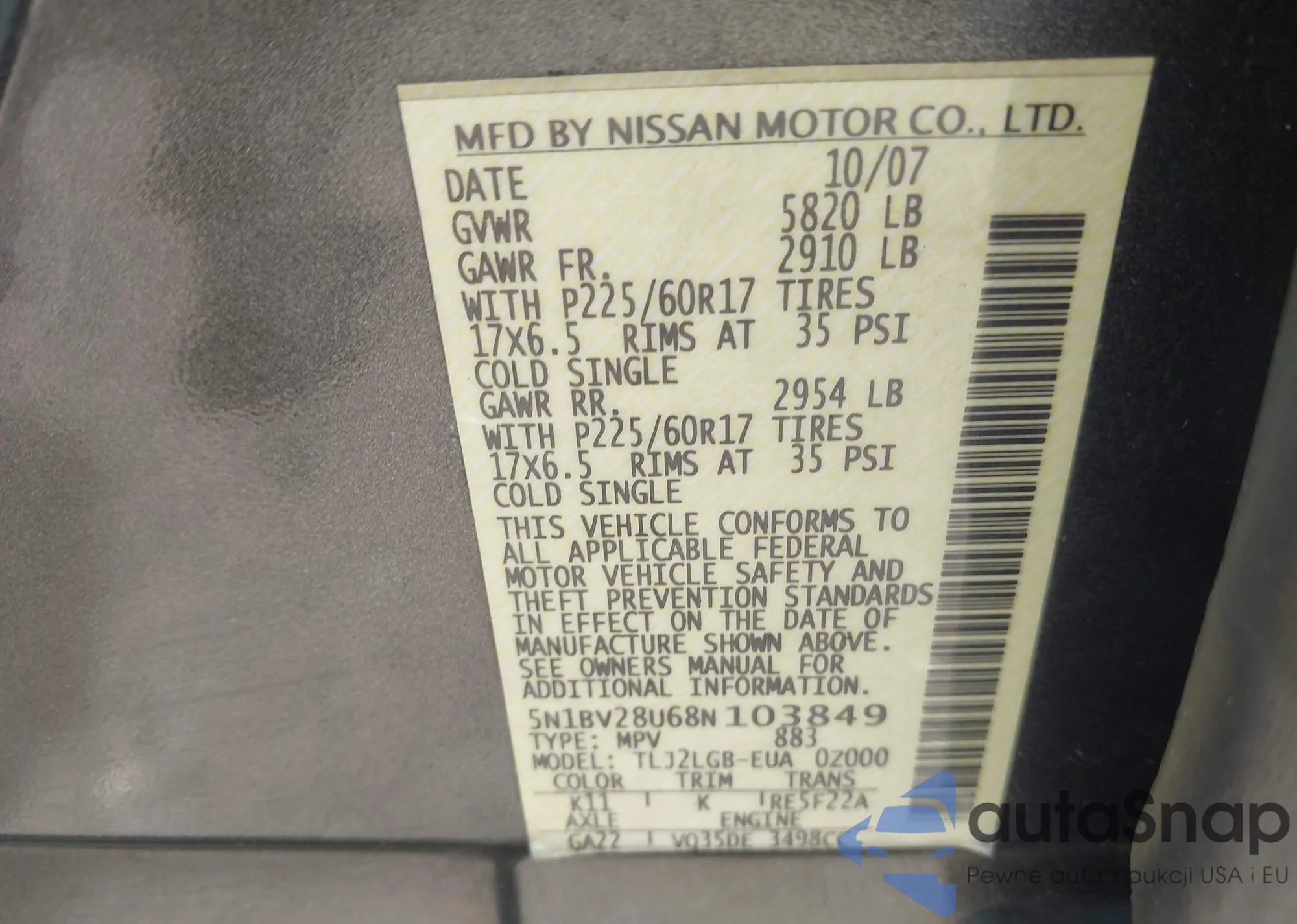 • VIN 2T2ADCAZ1SC021807
