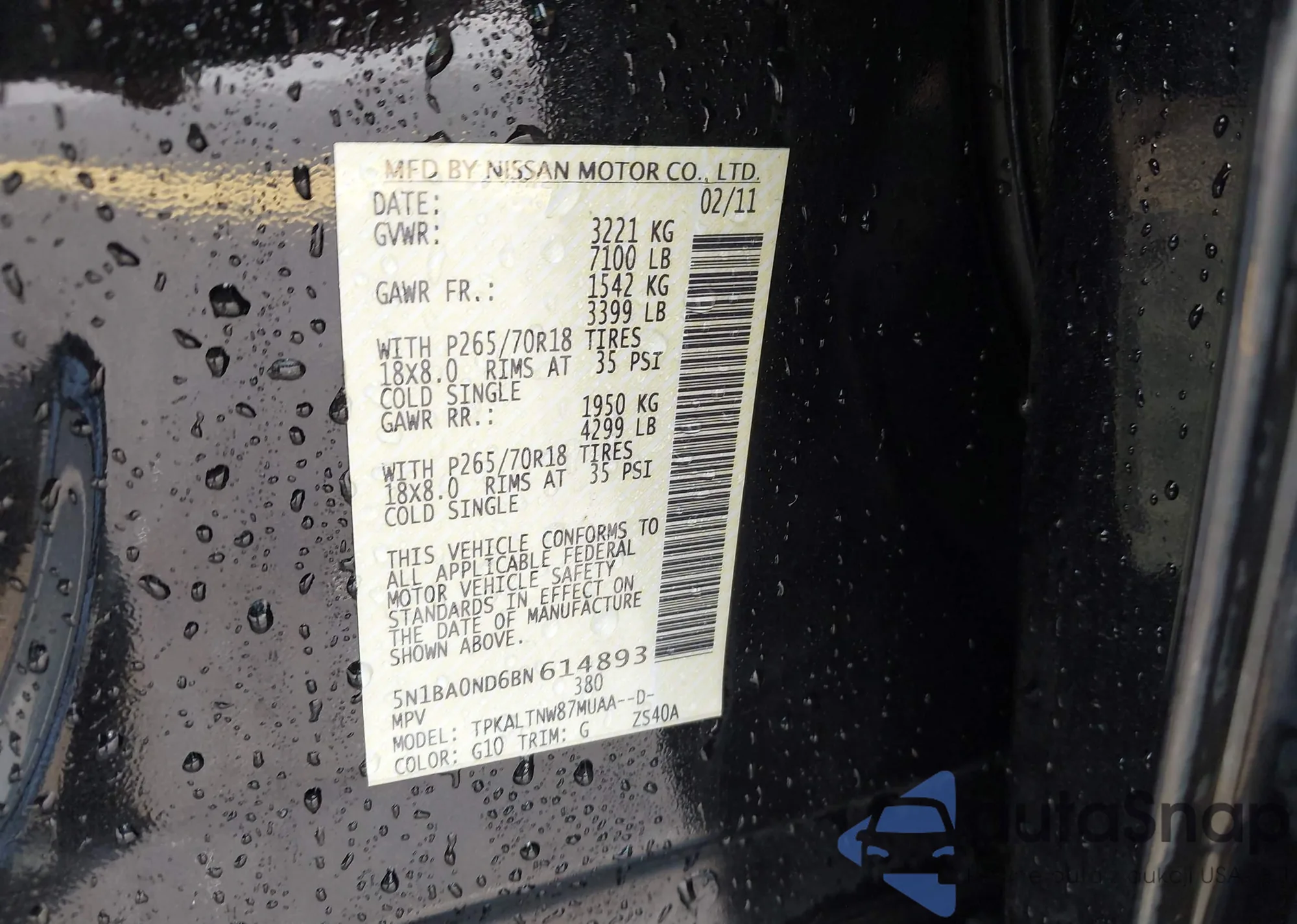 LOT: 42727146 VIN: 5N1BA0ND6BN614893