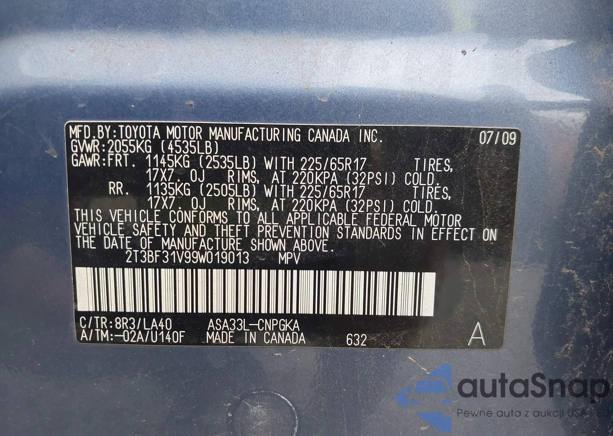 • VIN 2T3BF31V99W019013
