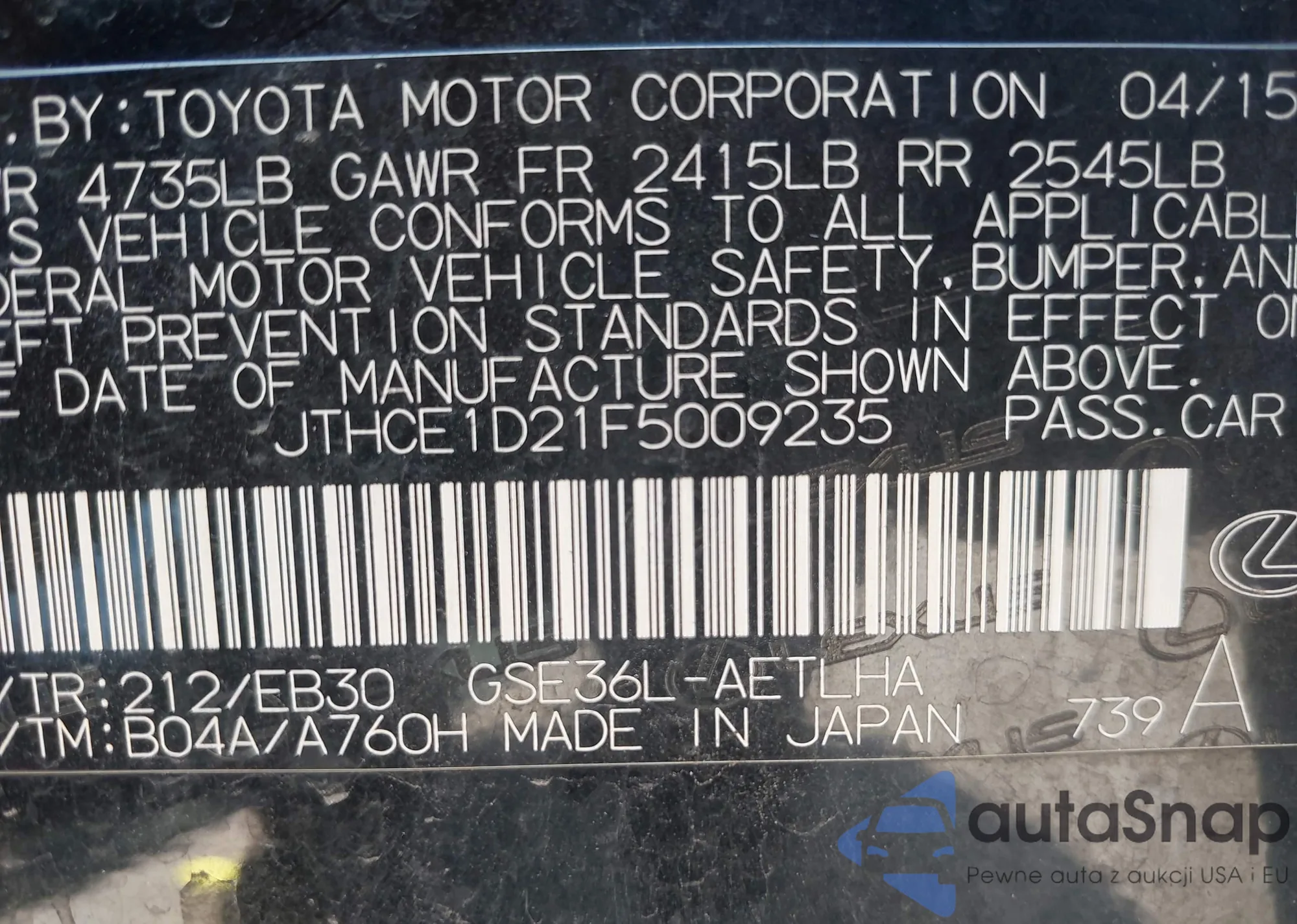 LOT: 42542830 VIN: JTHCE1D21F5009235