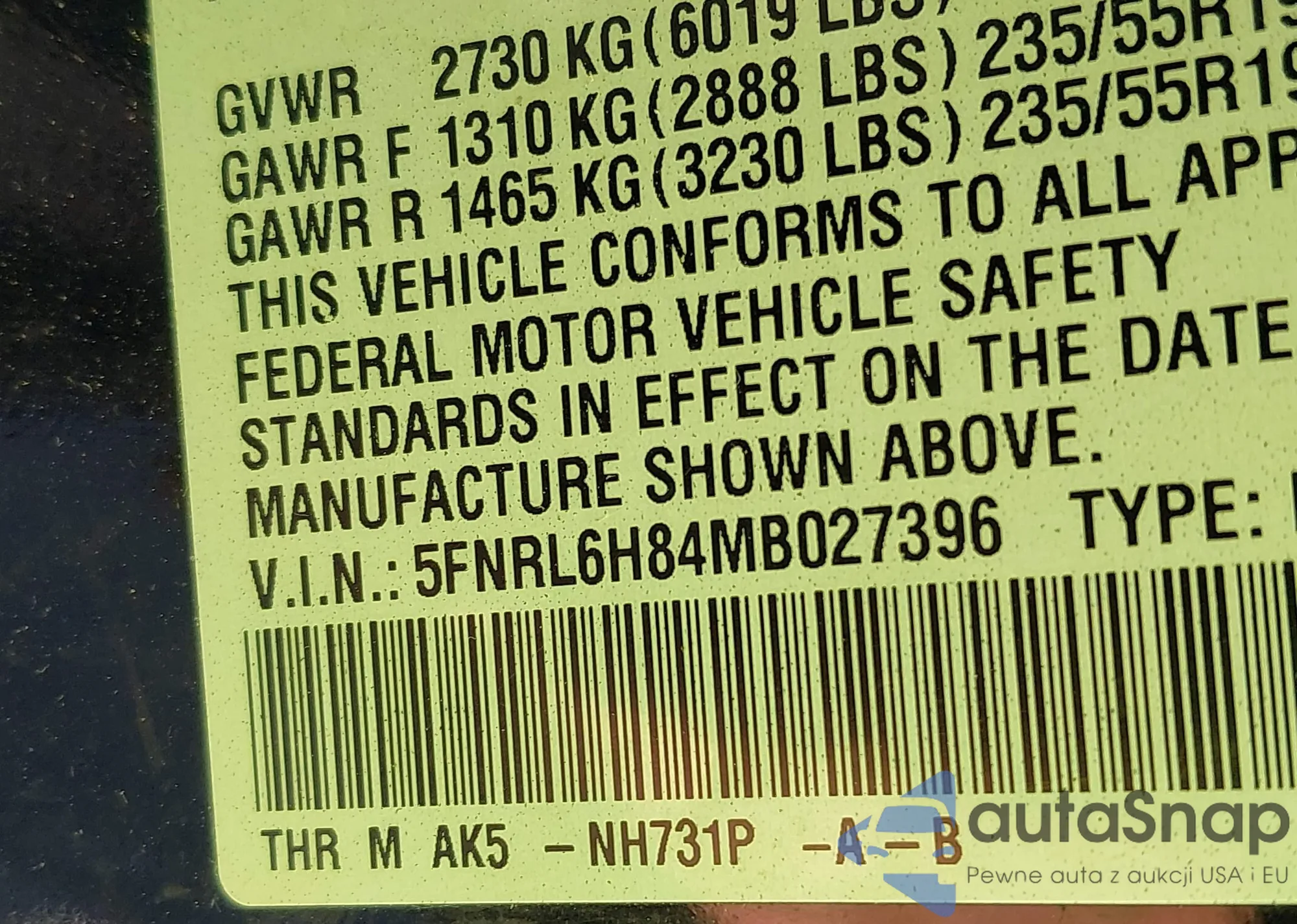 • VIN 5FNRL6H84MB027396