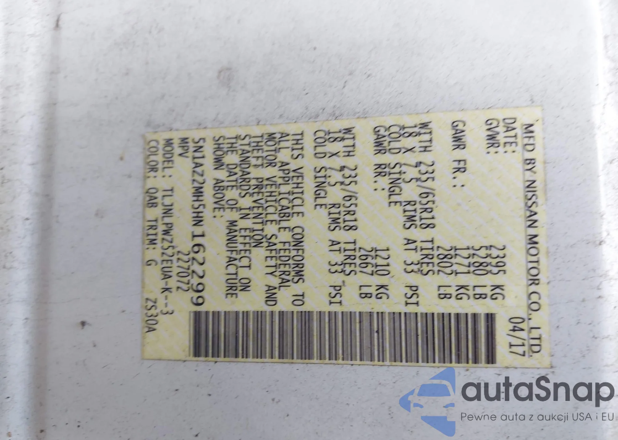 LOT: 42734432 VIN: 5N1AZ2MH5HN162299