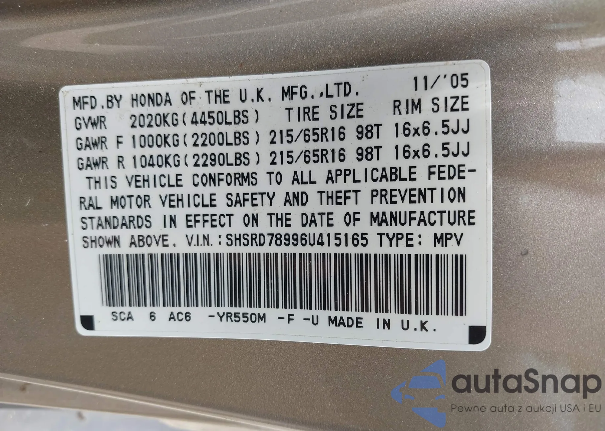 LOT: 42400387 VIN: SHSRD78996U415165