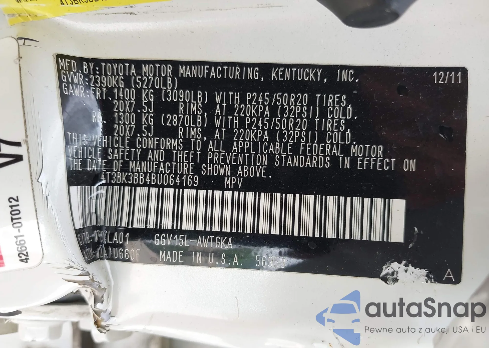 LOT: 42502591 VIN: 4T3BK3BB4BU064169