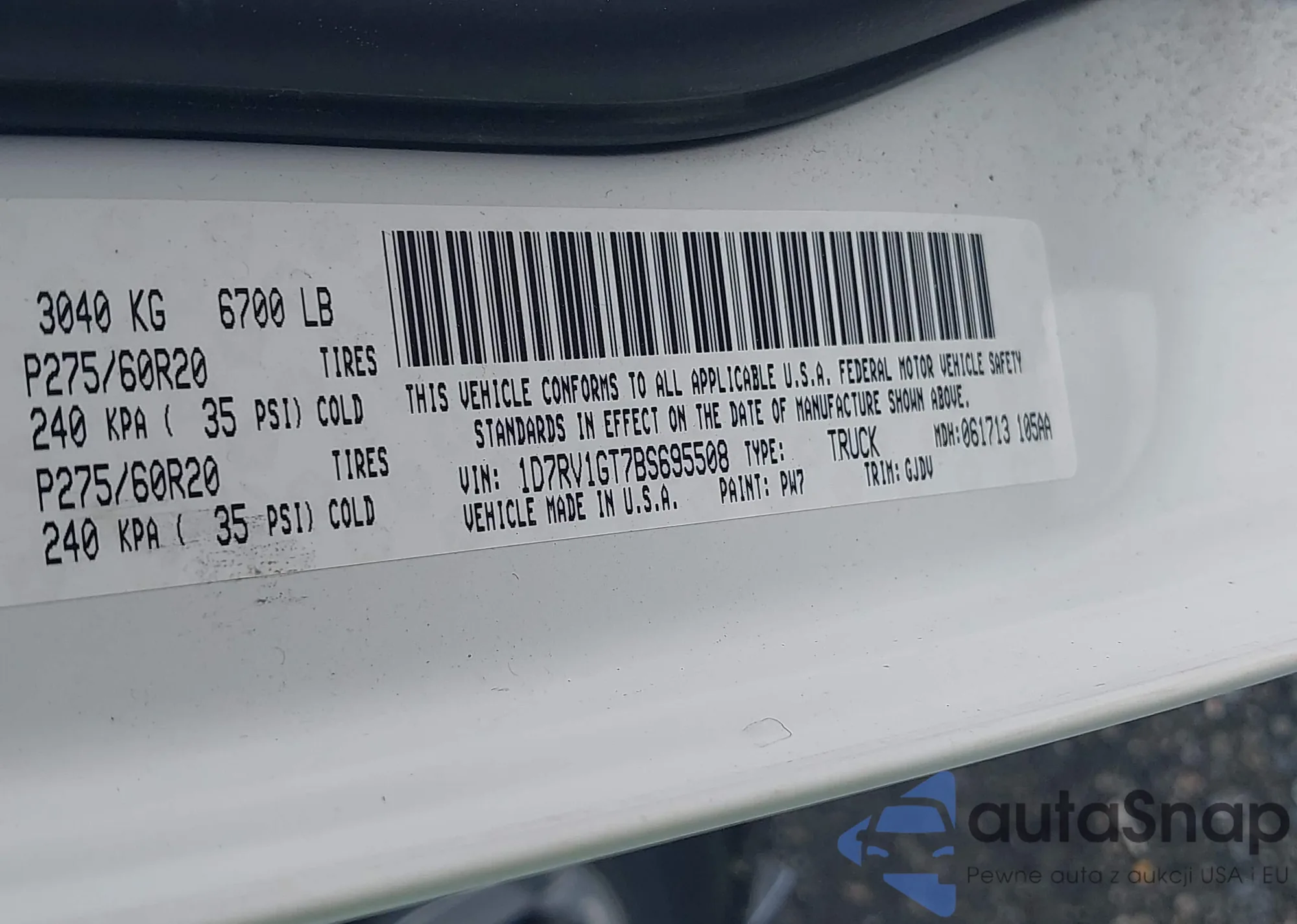 LOT: 42766586 VIN: 1D7RV1GT7BS695508