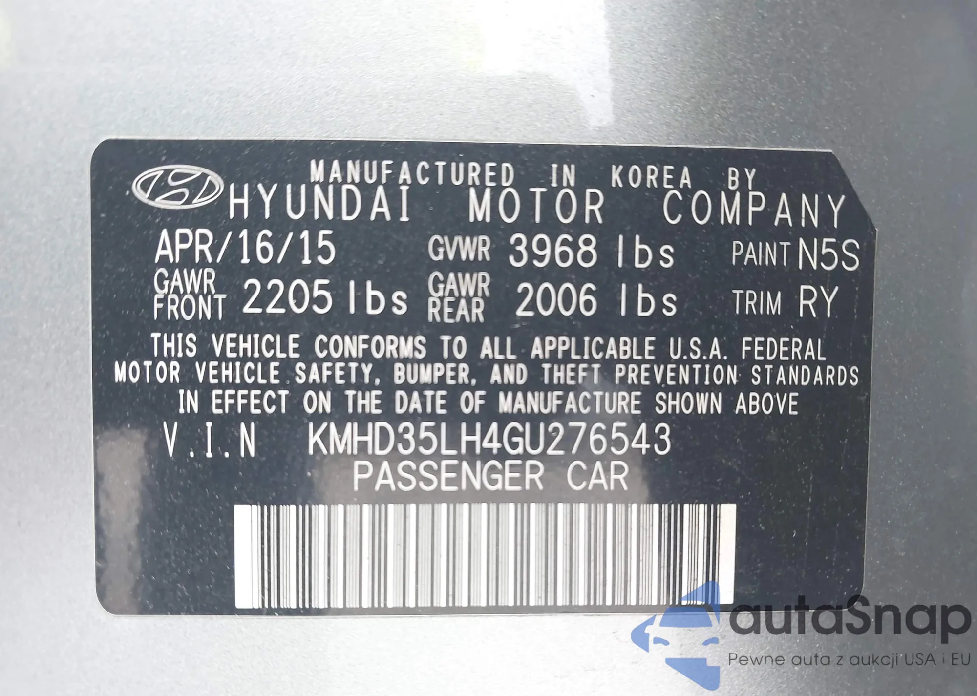 LOT: 42699585 VIN: KMHD35LH4GU276543