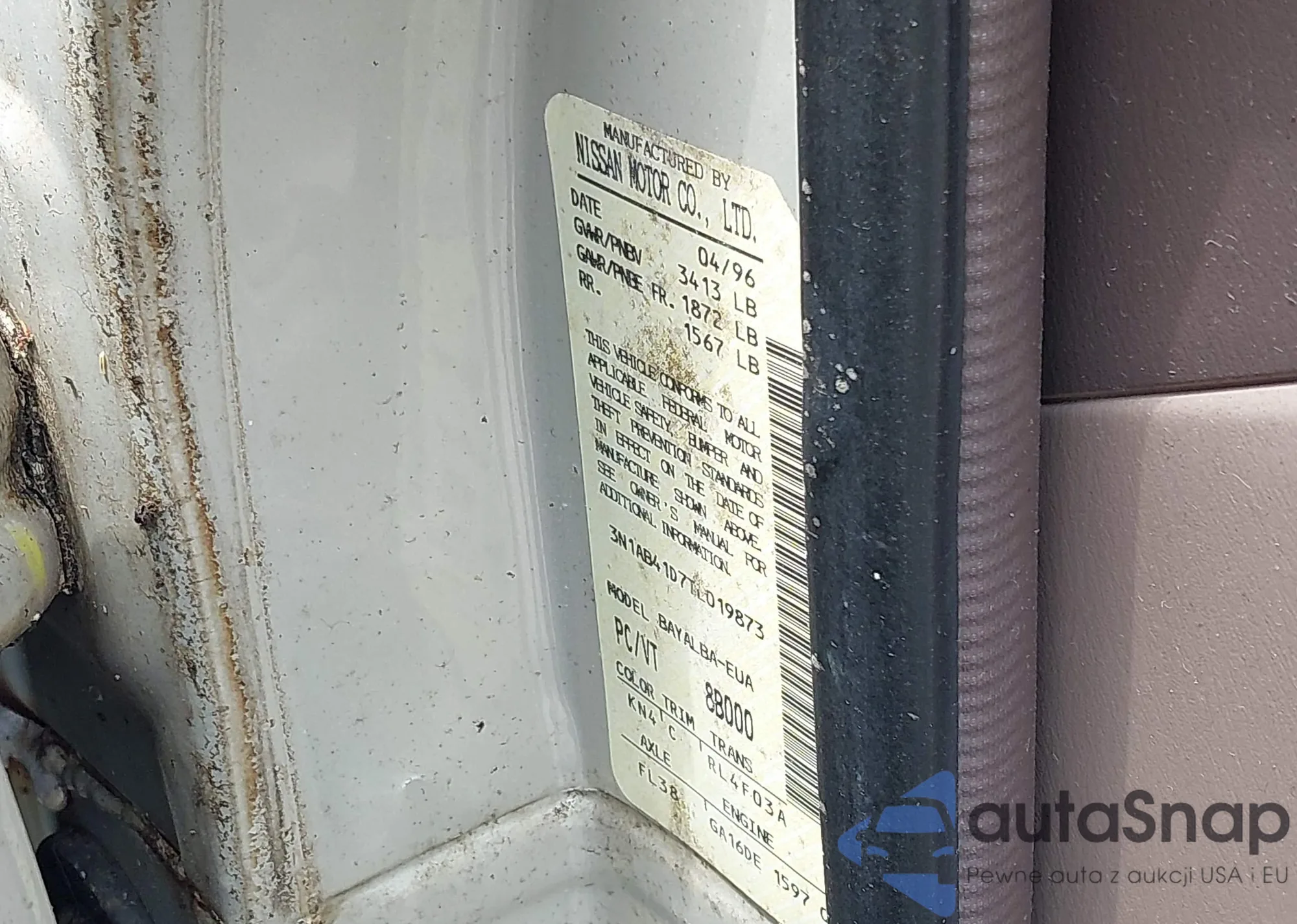 1996 Nissan Sentra Xe/Gxe z USA, uszkodzony, nr VIN 3N1AB41D7TL019873
