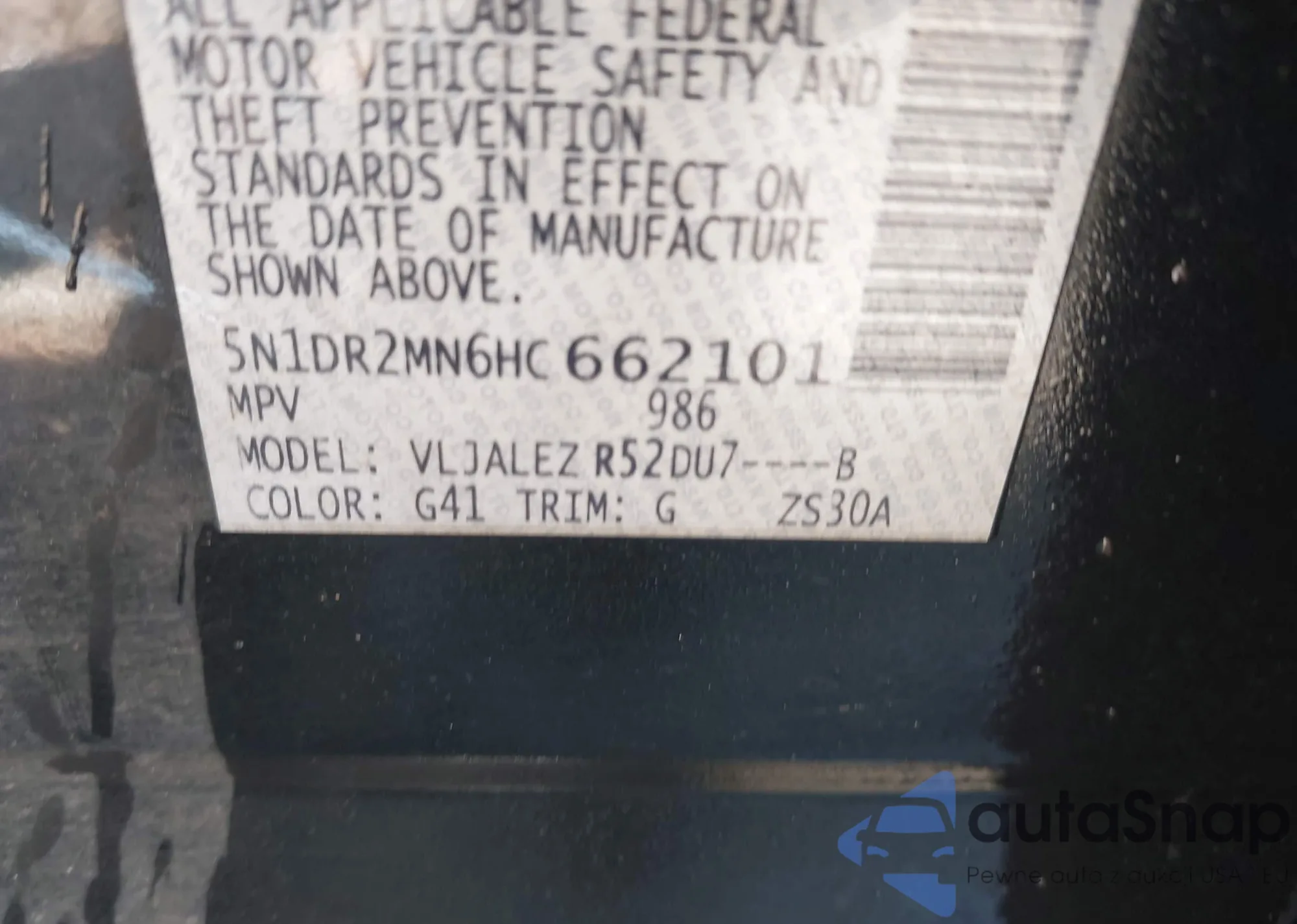 LOT: 42558887 VIN: 5N1DR2MN6HC662101