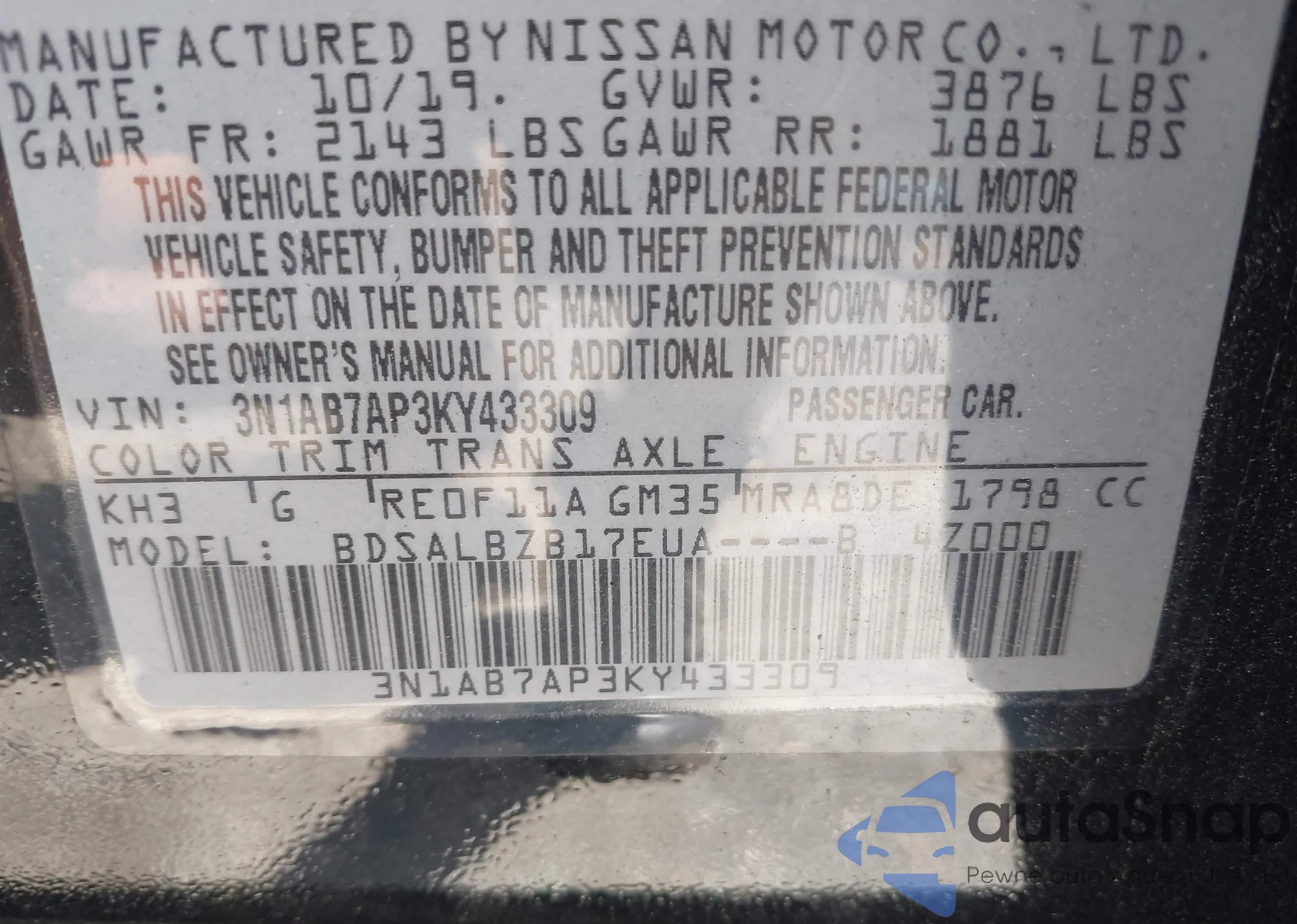 • VIN 3N1AB7AP3KY433309