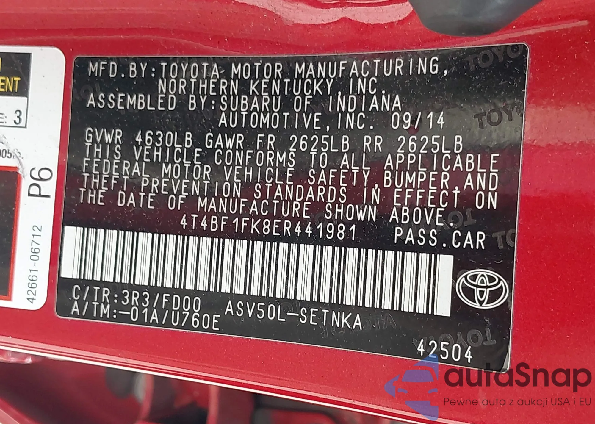 LOT: 42669352 VIN: 4T1BF1FK7EU452271