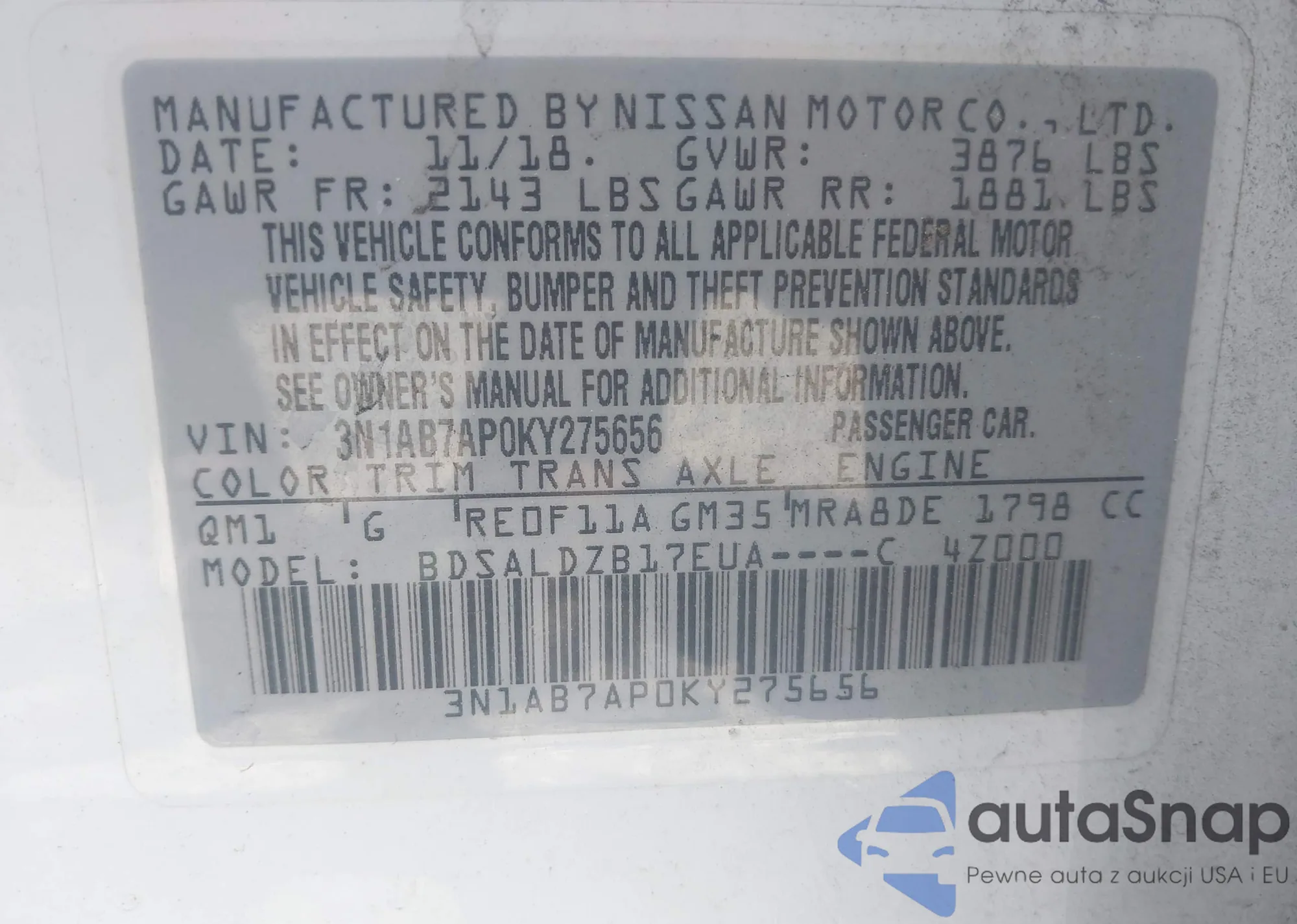 LOT: 42145776 VIN: 3N1AB7AP0KY275656