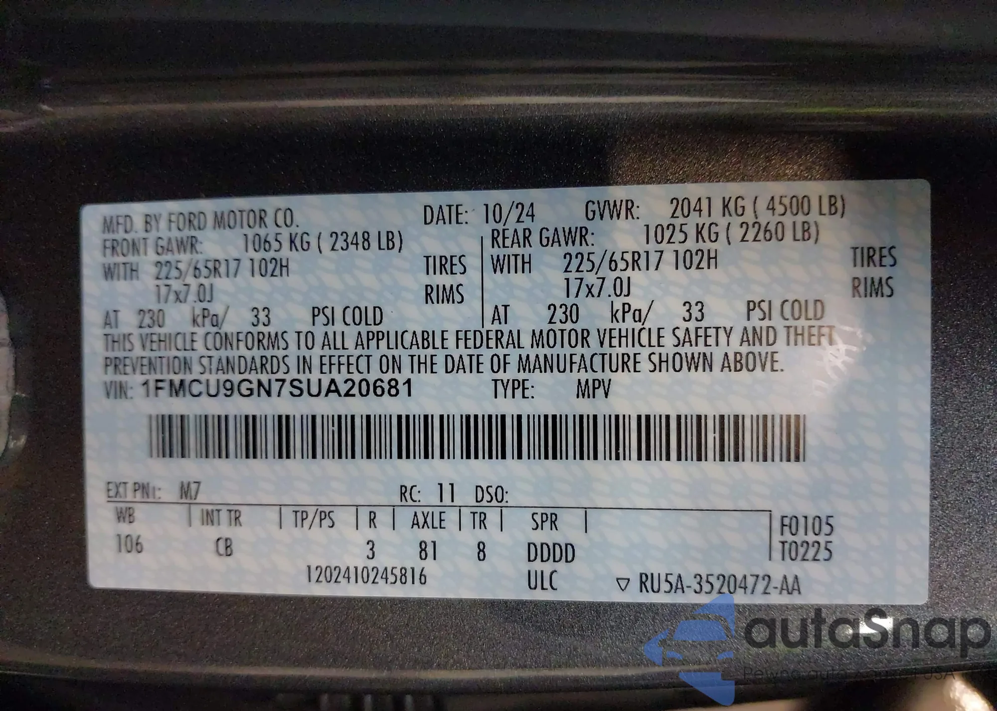 LOT: 42167908 VIN: 1FMCU9GN7SUA20681