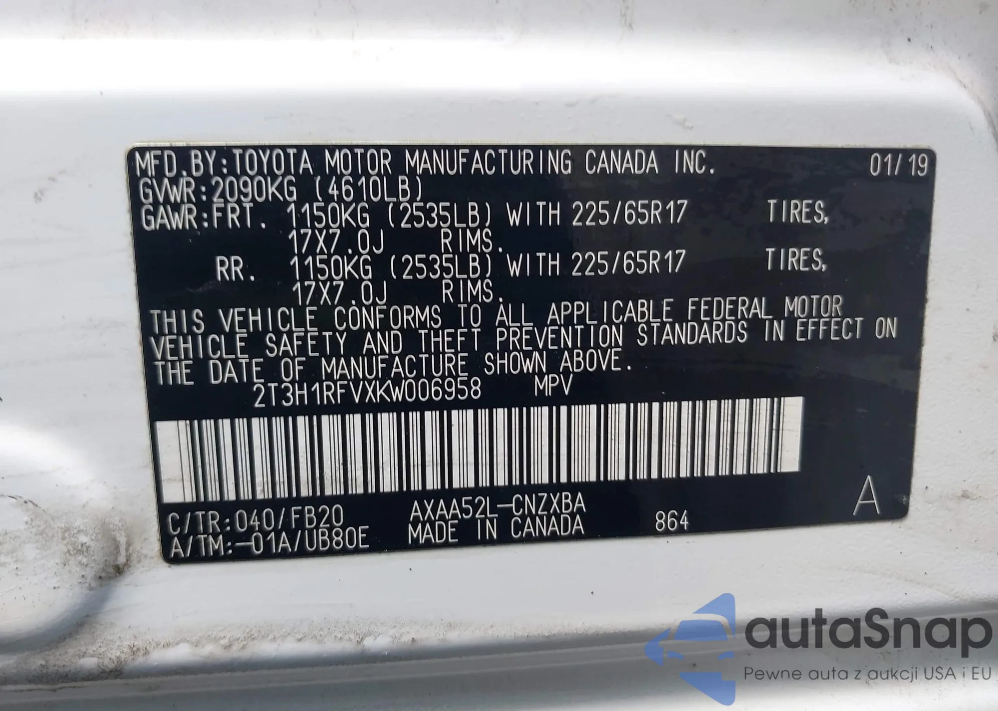 LOT: 42169619 VIN: 2T3H1RFVXKW006958