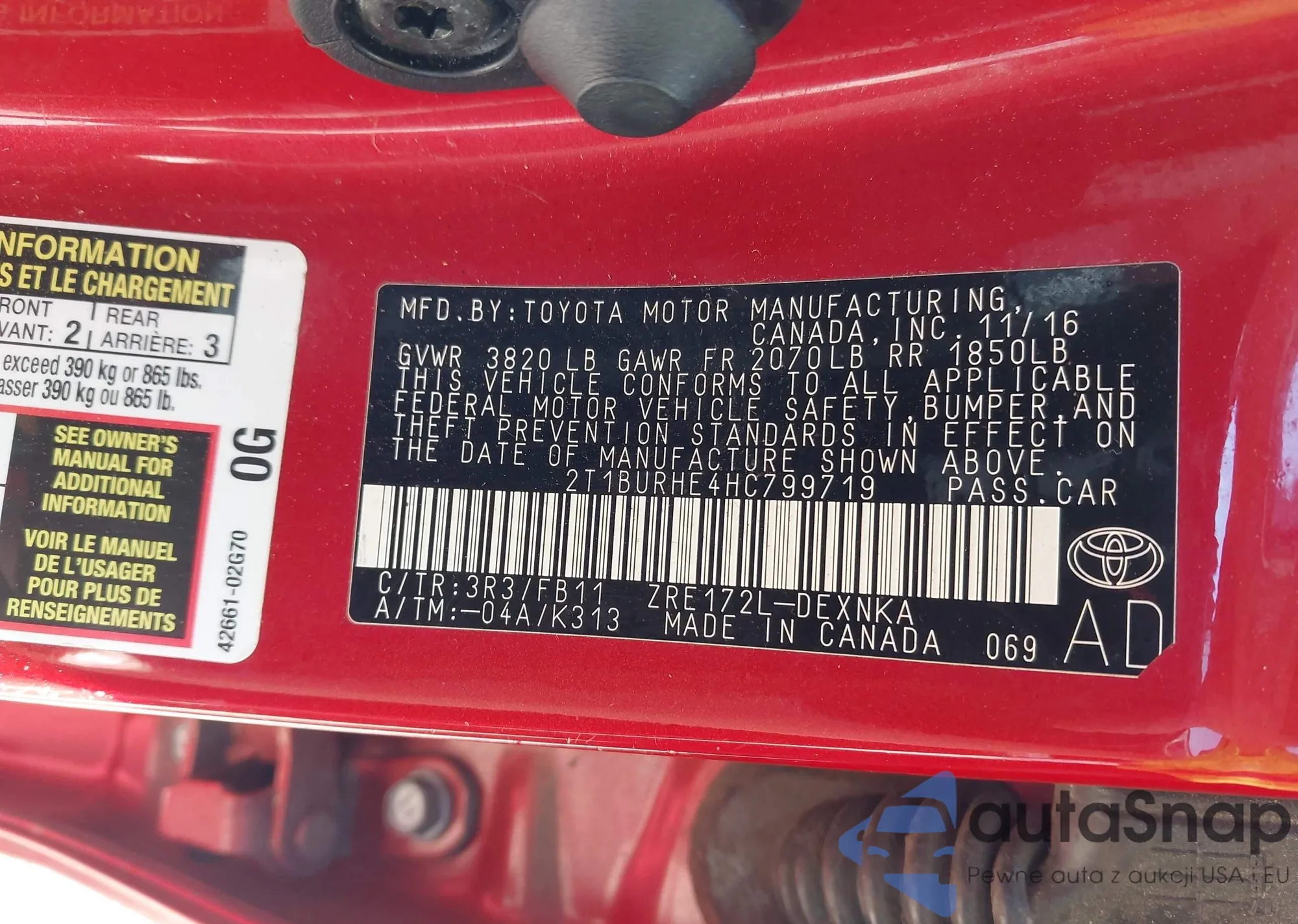 LOT: 42233633 VIN: 2T1BURHE4HC799719