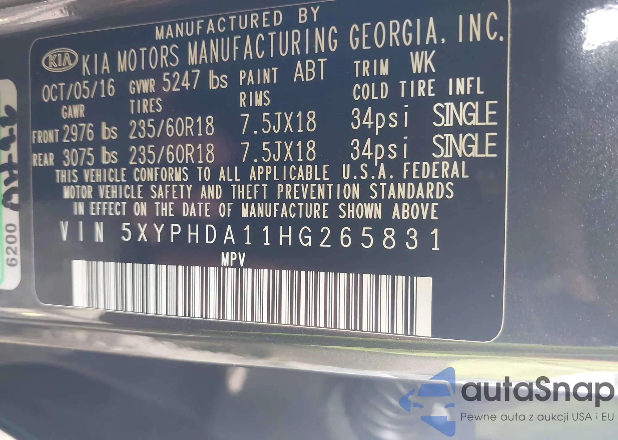 LOT: 42671408 VIN: KNAFU4A23A5862734