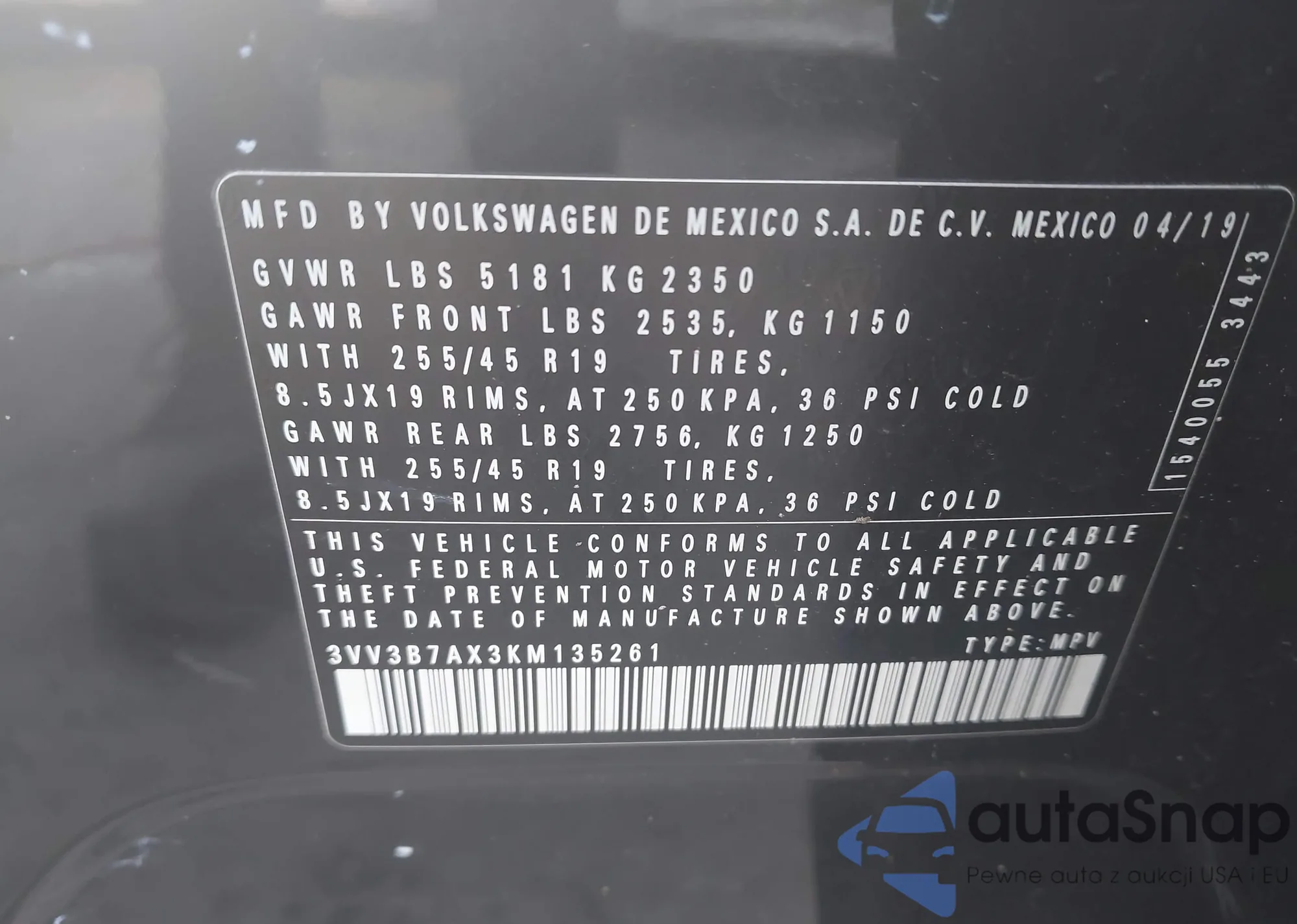• VIN 3VV3B7AX3KM135261