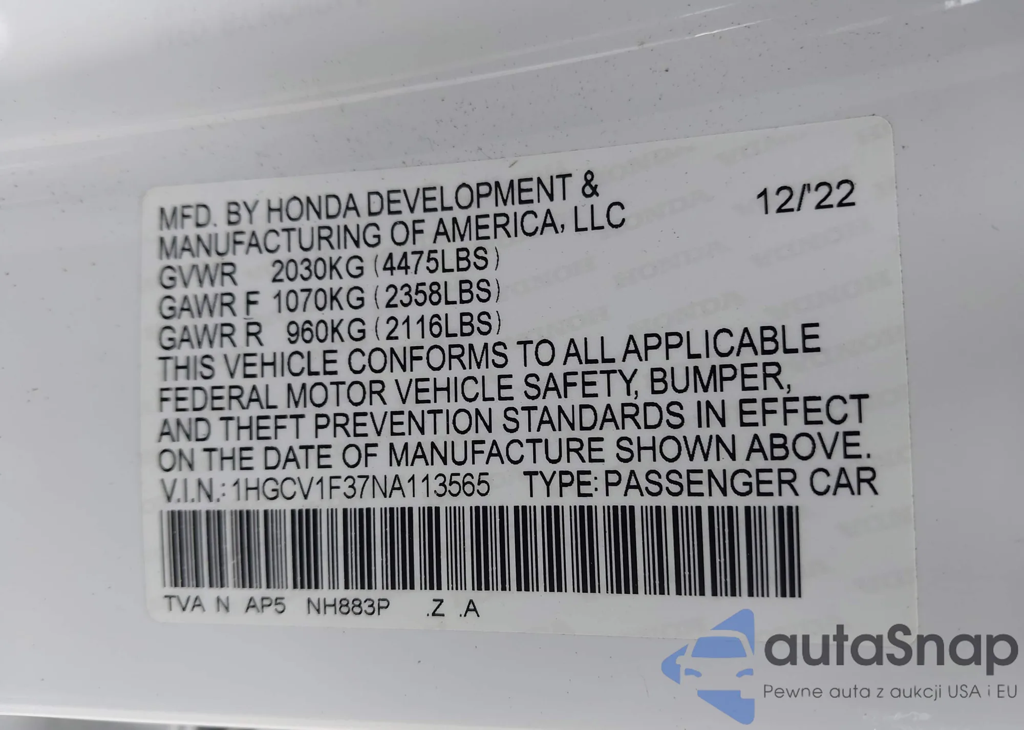 LOT: 42299261 VIN: 1HGCR2F37HA074894