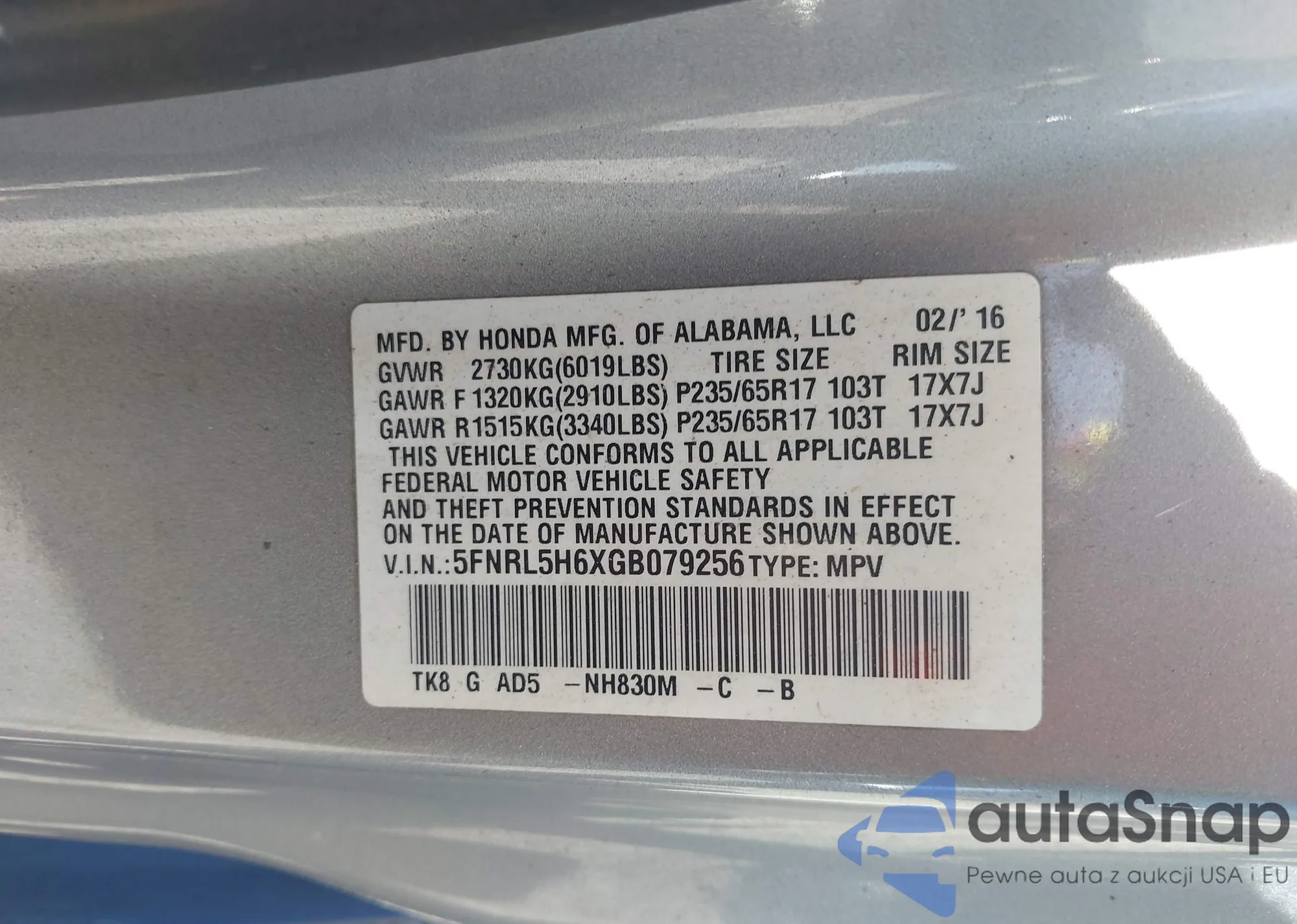• VIN 5FNRL5H66FB038542