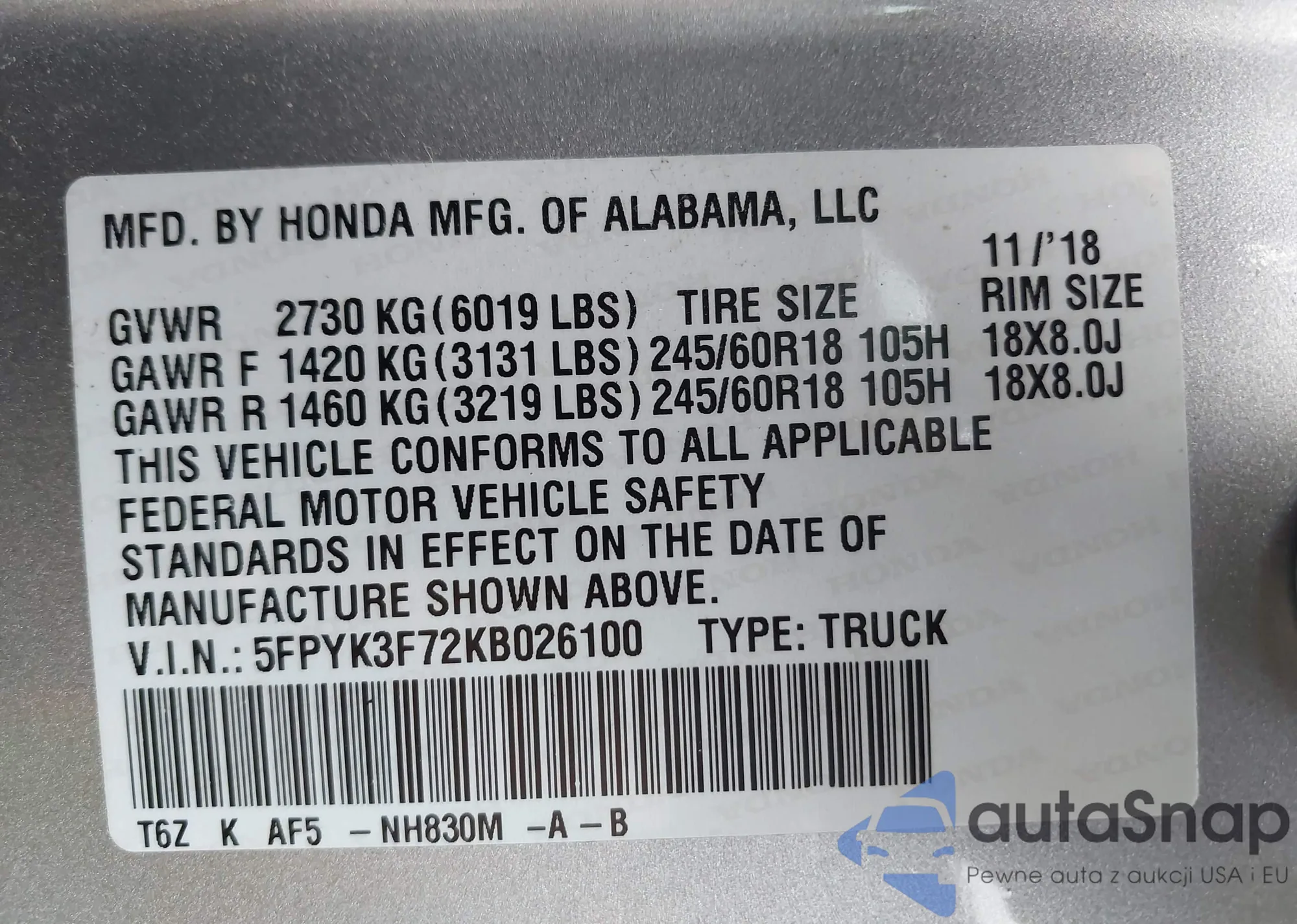• VIN 5FNYF3H51BB020006