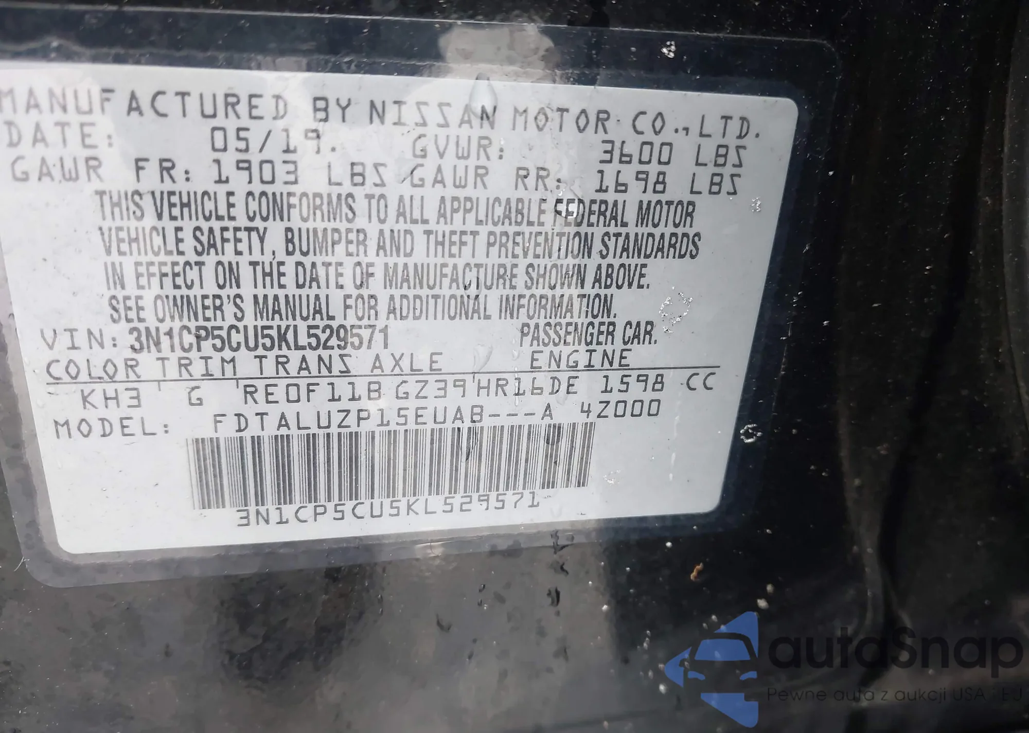 LOT: 42214535 VIN: 3N1CP5CU5KL529571