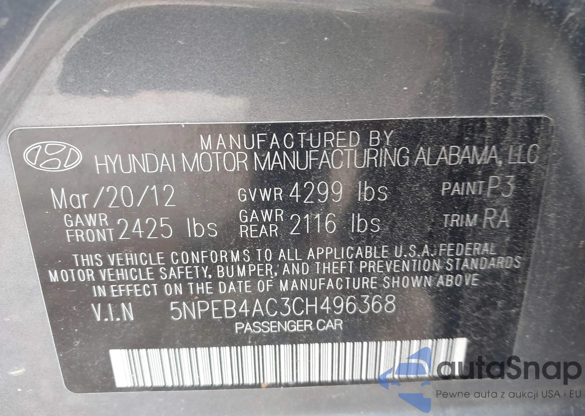 • VIN 5NPEB4AC3CH496368