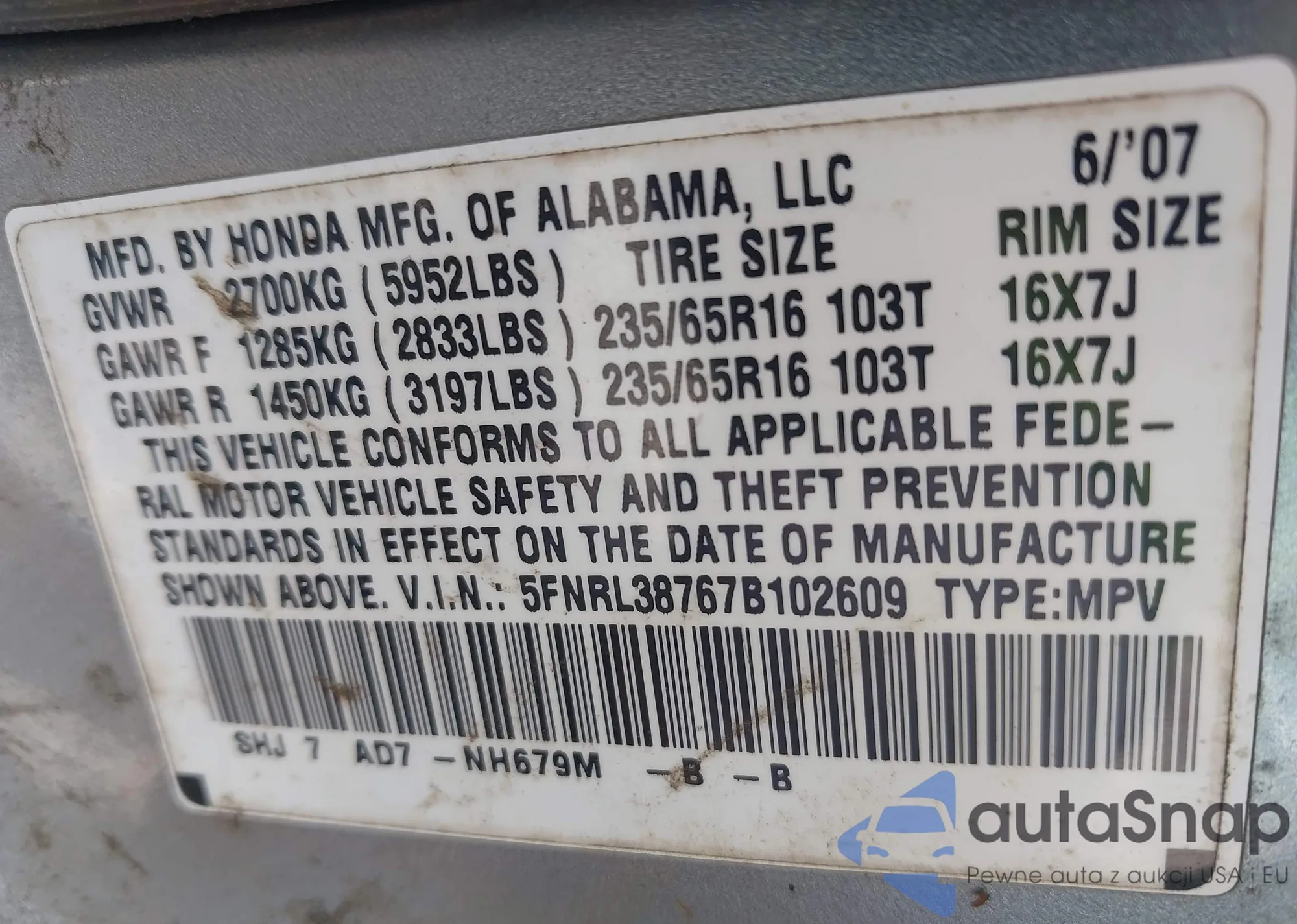 LOT: 42746887 VIN: 5FNRL38767B102609