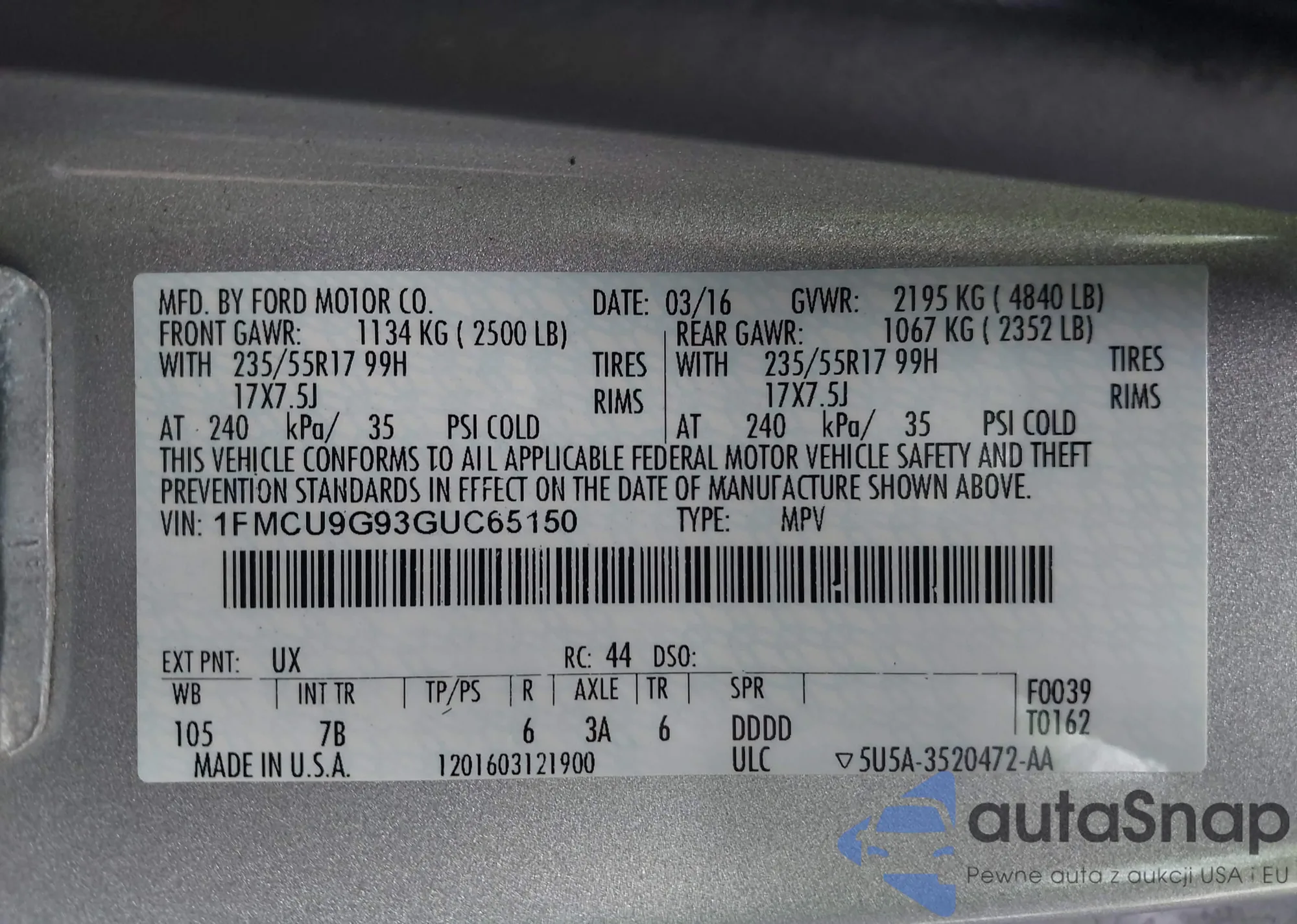 LOT: 42537528 VIN: 1FMSK7DH5LGB01733