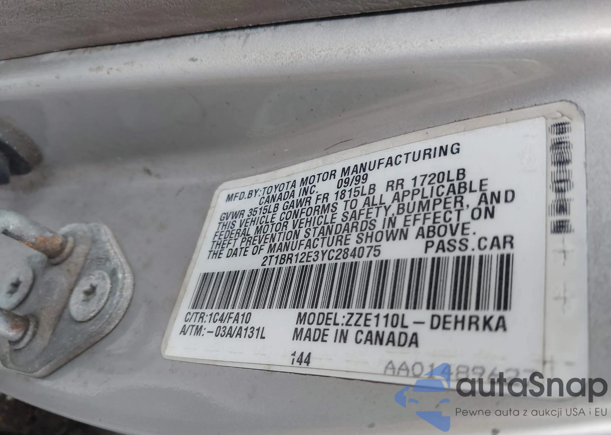 2000 Toyota Corolla Ve z USA, uszkodzony, nr VIN 2T1BR12E3YC284075