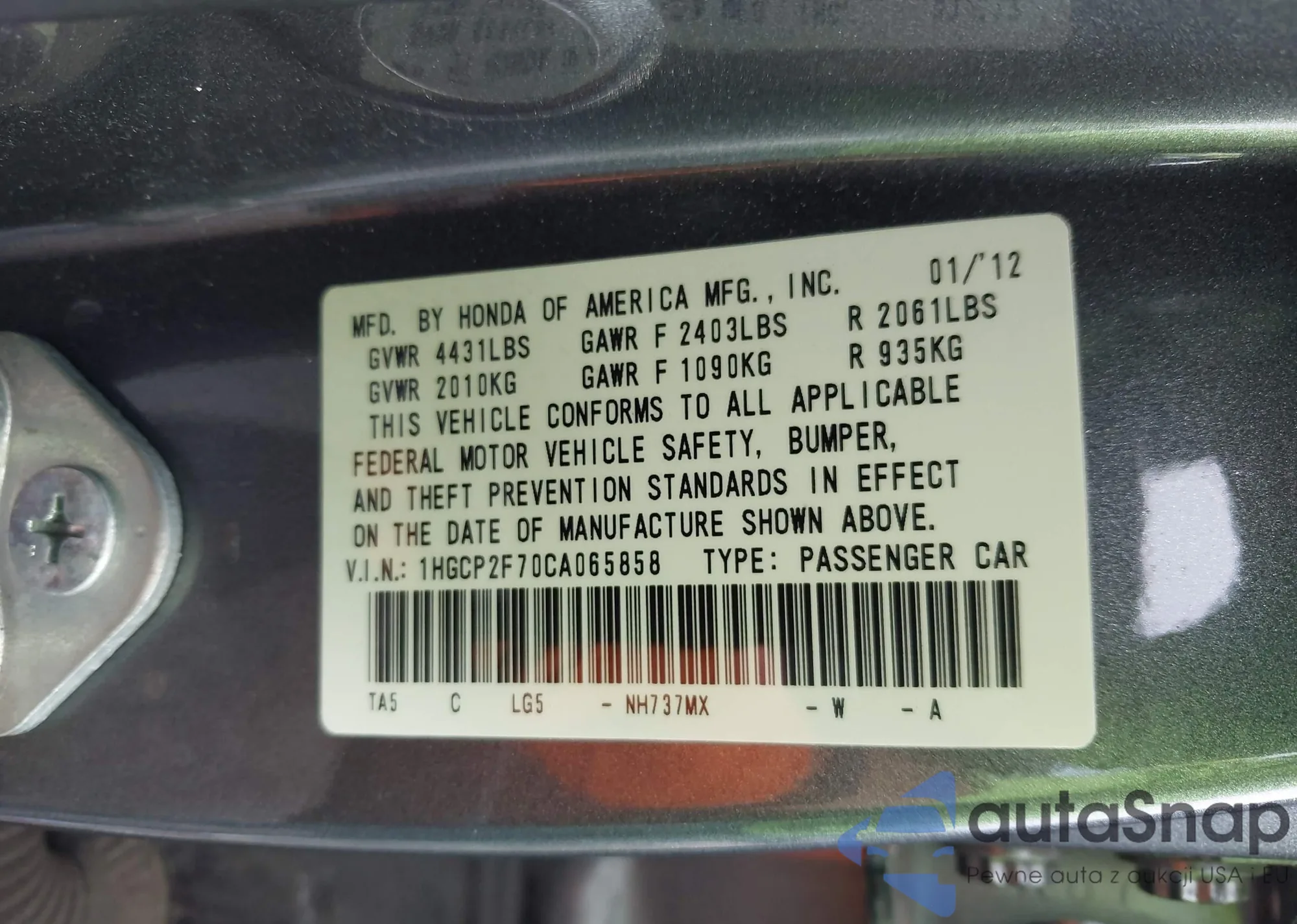 LOT: 42484822 VIN: JHMZF1D65CS003543