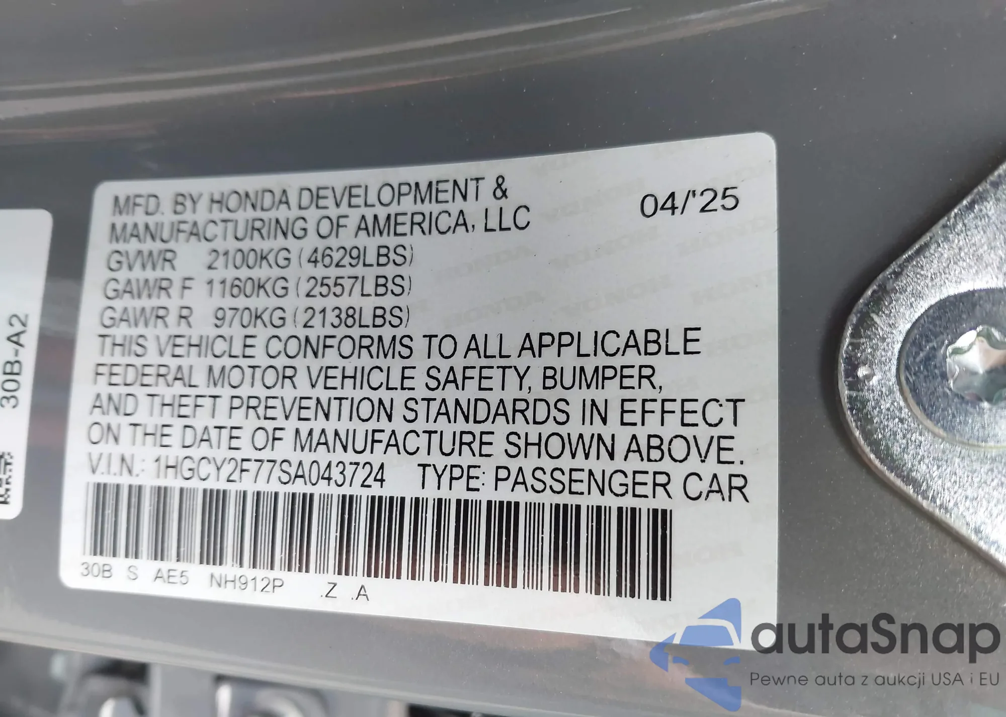 LOT: 42519133 VIN: 1HGCY2F77SA043724