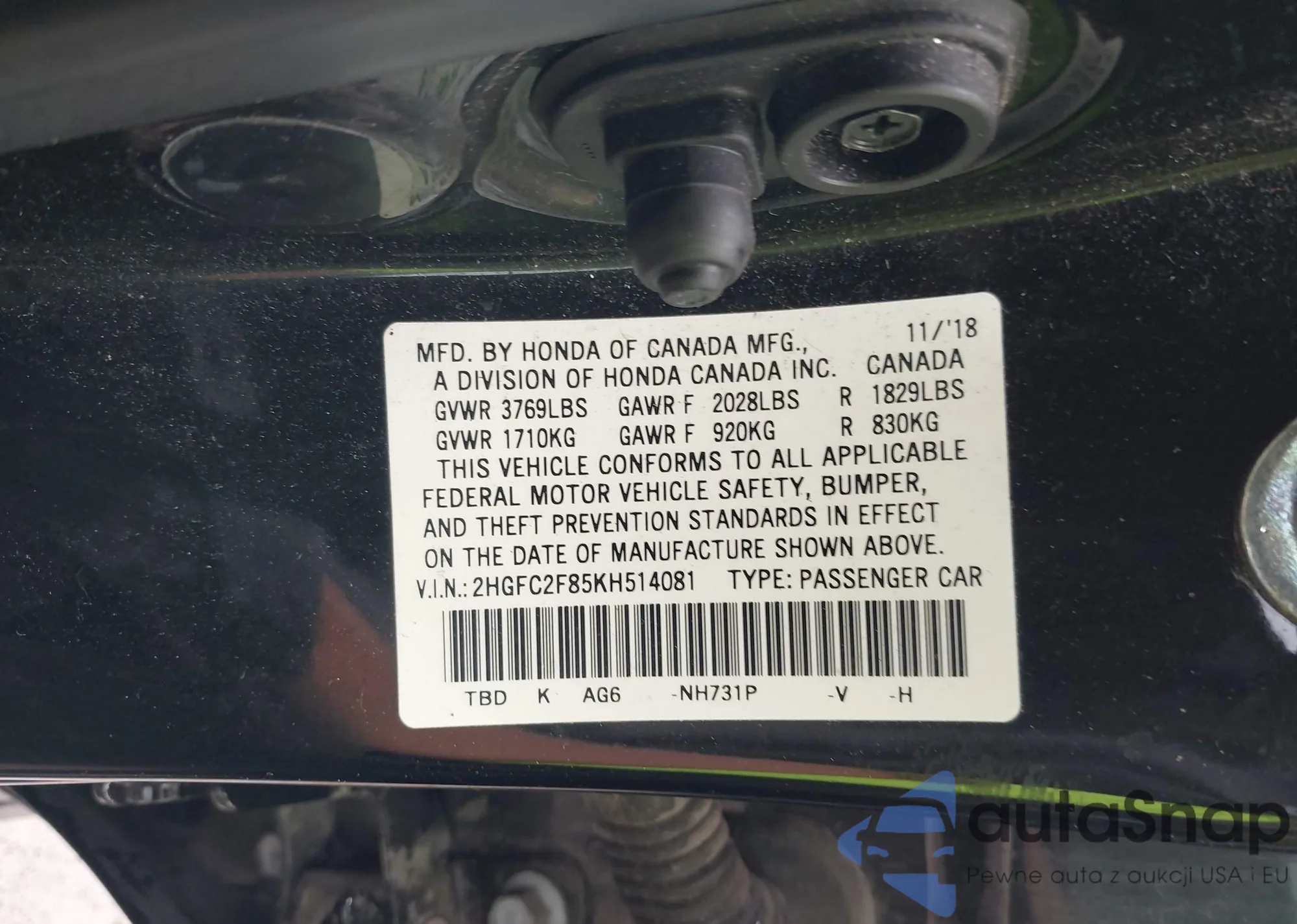 • VIN 2HGFC2F85KH514081